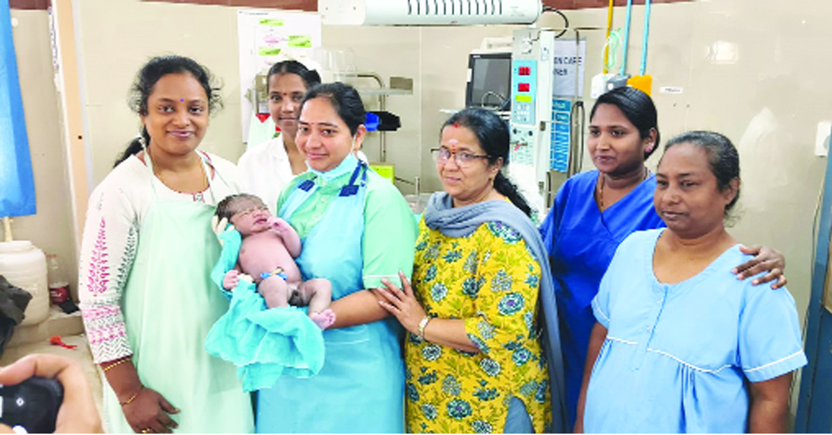 తెలంగాణ వైద్య విధాన పరిషత్ కింగ్ కోఠి జిల్లా ప్రభుత్వ దవాఖానాలో ఓ గర్భిణి సాధారణ ప్రసవం ద్వారా నాలుగు కిలోల మగ శిశువుకు జన్మనిచ్చింది. అయితే మొదటి కాన్పుకు సర్జరీ అయ్యి, రెండో కాన్పుకు నార్మల్ డెలివరీ ద్వారా ఇంత బరువు గల శిశువు జన్మించడం ఆస్పత్రిలో ఇదే తొలిసారి అని ఆస్పత్రి మెడికల్ సూపరింటెండెంట్ డాక్టర్ సంతోష్బాబు తెలిపారు. నల్లకుంట అచ్చయ్యనగర్ ప్రాంతానికి చెందిన బి.దుర్గభవానికి పురిటి నొప్పులు రావడంతో భర్త నాగరాజు ఈనెల 3న కింగ్ కోఠి జిల్లా ప్రభుత్వ ఆస్పత్రికి తీసుకొచ్చాడని చెప్పారు. వెంటనే గైనిక్ హెచ్ఓడీ డాక్టర్ జ్యోతిర్మయి లేబర్ రూమ్కు గర్భిణిని తరలించి వైద్య పరీక్షలు నిర్వహించారన్నారు. అదే రోజు ఉదయం 9 గంటల సమయంలో ఆమె సాధారణ ప్రసవం ద్వారా నాలుగు కిలోల బరువున్న మగ శిశువుకు జన్మనిచ్చిందని తెలిపారు. శిశువు, తల్లి క్షేమంగా ఉన్నారని చెప్పారు. ఈ సందర్భంగా హెచ్ఓడీ డాక్టర్ను, డాక్టర్ సరిత, మెడ్ వైఫ్ సంతోషి, లేబర్ ఇన్చార్జి చంద్రలీల, స్టాఫ్ నర్స్ స్వప్నను సూపరింటెండెంట్ డాక్టర్ సంతోష్, ఆర్ఎంఓ డాక్టర్ సాధన అభినందించారు.