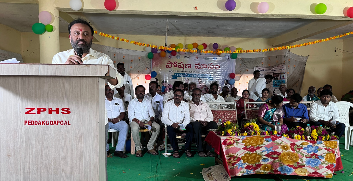 పెద్ద కొడపగల్ మండల కేంద్రంలో ఐసిడిఎస్ ఆధ్వర్యంలో జరిగిన పోషణ మాసం ఘనంగా నిర్వహించారు. ఈ కార్యక్రమానికి ముఖ్య అతిథిగా జుక్కల్ నియోజకవర్గ శాసనసభ్యులు తోట లక్ష్మీకాంతరావు హాజరయ్యారు. అనంతరం ఎమ్మెల్యే తోట లక్ష్మీకాంతరావు మాట్లాడుతూ… ఆరోగ్యకరమైన జీవనానికి అవసరమైన పౌష్టిక ఆహారం గురించి ప్రతి ఇంటిలో అవగాహన కల్పించడమే పోషణ మాసం ముఖ్య ఉద్దేశమని అన్నారు.కుటుంబం ఆరోగ్యంగా ముందుకు వెళ్లాలంటే కుటుంబంలో మహిళల పాత్ర ముఖ్యమని అన్నారు. మహిళలు గర్భిణీలు చిన్నారుల ఆరోగ్య సంరక్షణలో పోషకాహార ప్రాముఖ్యత ఎంతో గాను ఉంటుందని అన్నారు. ప్రతి కుటుంబం ఆరోగ్యవంతంగా ఉండేందుకు సమాజంలో పోషణ పై అంగన్వాడీ సిబ్బంది అవగాహన కల్పించాలని అన్నారు.
