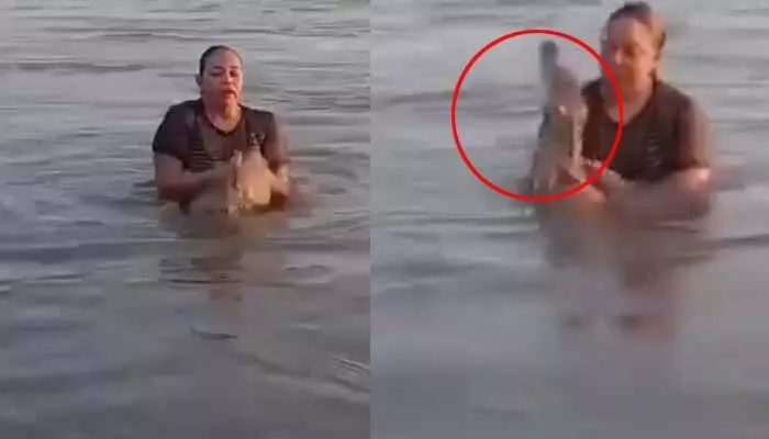 చేప అనుకొని మొసలిని పట్టుకున్న యువతి..