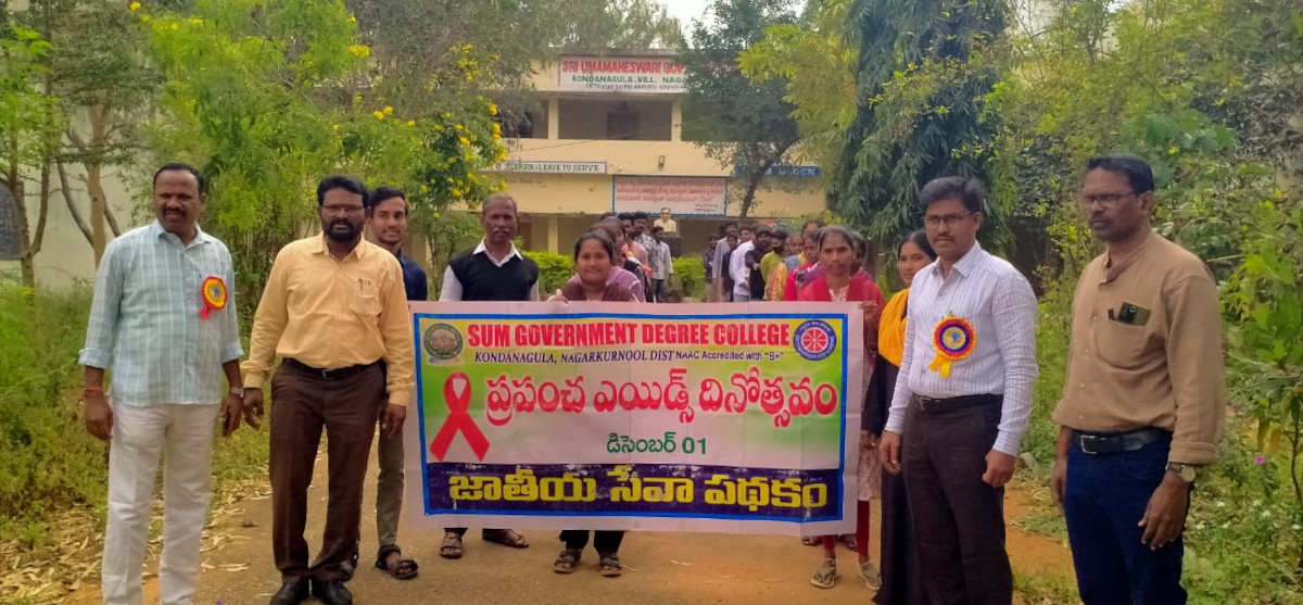 మండలంలోని శ్రీ ఉమామహేశ్వరి ప్రభుత్వ డిగ్రీ కళాశాల కొండనాగుల విద్యార్థులు సోమవారం ప్రపంచ ఎయిడ్స్ దినోత్సవం సందర్భంగా ఎయిడ్స్ ర్యాలీ నిర్వహించారు.  కళాశాల ఎన్ ఎస్ ఎస్ యూనిట్ ఆధ్వర్యంలోనిర్వహించిన ర్యాలీ కార్యక్రమాల్లో కళాశాల ప్రిన్సిపాల్  పరంగి రవి మాట్లాడుతూ.. విద్యార్థులకు ఎయిడ్స్ వ్యాప్తి కారణాలు, నివారణ చర్యలు, అవగాహన అవసరం గురించి తెలుసుకోవాలన్నారు. ఎయిడ్స్‌పై ఉన్న అపోహలను తొలగించడం మరియు సమాజంలో అవగాహన పెంపొందించడం యువత బాధ్యత అని పేర్కొన్నారు.