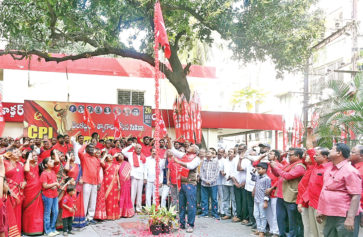 ‘సీపీఐ వందేండ్ల ఆవిర్భావ దినోత్సవ సభ’ను హైదరాబాద్లోని సీపీఐ రాష్ట్ర కార్యాలయంలో శుక్రవారం నిర్వహించారు. సీపీఐ పతాకాన్ని కూనంనేని ఎగురవేశారు. అనంతరం ఆ పార్టీ రాష్ట్ర సహాయ కార్యదర్శి ఈటీ.నర్సింహ అధ్యక్షతన జరిగిన సభలో కూనంనేని మాట్లాడుతూ…సీపీఐ ఆధ్వర్యంలో జరిగిన తెలంగాణ సాయుధ పోరాట చరిత్ర ప్రపంచ పుట్ట ల్లో లిఖించదగిందన్నారు. జైలులోనే భారత కమ్యూనిస్టు పార్టీ పుట్టిందనీ, పుట్టుకలోనే పార్టీ గొంతు నులిమేయాలని ప్రయత్నించారని గుర్తుచేశారు. ఉరితీసినా, యావజ్జీవ శిక్ష లు విధించినా, కుట్ర కేసులు పెట్టినా కమ్యూనిస్టు నేతలు వెనుకడుగు వేయలేదన్నారు. ప్రధాని మోడీ, బీజేపీ లాంటి తిరోగమన శక్తులు, కార్పొరేట్లకు ఊడిగం చేసే సిద్ధాంతం కలిగిన వాళ్లు కమ్యూనిజం అంటేనే ఒక భూతంగా చూపించే ప్రయత్నం చేయడాన్ని తప్పుబట్టారు. పేదరికం లేకుండా చేస్తామని చెప్పాల్సిన ప్రభుత్వం 2026 మార్చి నాటికి మావోయిస్టులు లేకుండా చేస్తామని చెప్పడం సిగ్గుచేటన్నారు.