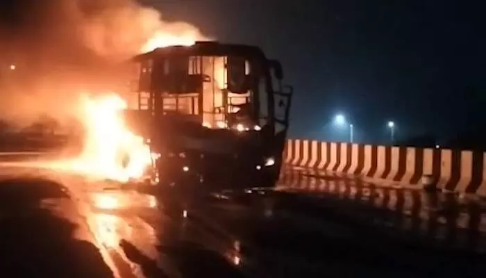 నవతెలంగాణ-హైదరాబాద్ : తూర్పుగోదవరి జిల్లా కొవ్వూరు సమీపంలో బస్సు ప్రమాదం జరిగింది. ఖమ్మం నుంచి విశాఖ వెళ్తున్న RRR ప్రయివేటు ట్రావెల్స్ బస్సులో ఒక్కసారిగా మంటలు చెలరేగాయి. ప్రయాణికులు వెంటనే కిందికి దిగడంతో ప్రాణాపాయం తప్పింది. అనంతరం బస్సు పూర్తిగా కాలిపోయింది. ఘటనతో హైవేపై భారీ ట్రాఫిక్ జామ్ అయింది. సంక్రాంతి వేళ ప్రయివేటు బస్సు దగ్ధమవడం ఆందోళనకు గురిచేస్తోంది. ఇటీవల కర్నూలు బస్సు ప్రమాదంలో 19మంది మరణించిన విషయం తెలిసిందే.