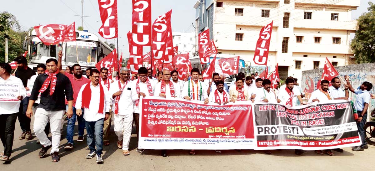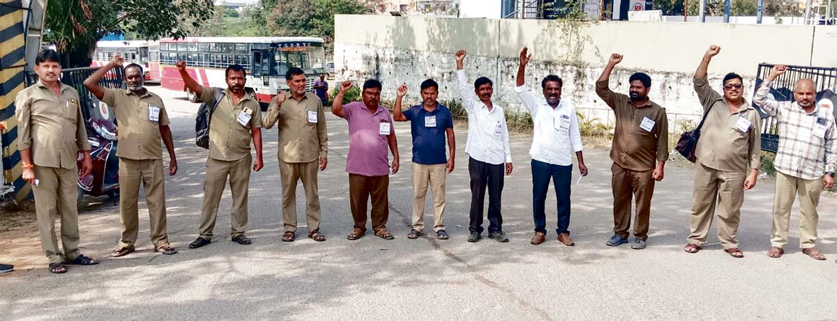 కేంద్ర ప్రభుత్వం తీసుకొచ్చిన కార్మిక వ్యతిరేక లేబర్ కోడ్ల అమలును రద్దు చేయాలని స్టాఫ్ అండ్ వర్కర్స్ ఫెడరేషన్ (సీఐటీయూ) ఆధ్వర్యంలో బుధవారం రాష్ట్ర వ్యాప్తంగా వివిధ డిపోల వద్ద నల్ల బ్యాడ్జీలు ధరించి నిరసన తెలిపారు. ఈ సందర్భంగా హైదరాబాద్లో జరిగిన కార్యక్రమంలో స్టాఫ్ అండ్ వర్కర్స్ ఫెడరేషన్ అధ్యక్ష, ప్రధాన కార్యదర్శులు వీరాంజనేయులు, వీఎస్.రావు మాట్లాడుతూ కేంద్ర ప్రభుత్వ లేబర్ పాలసీ ”శ్రమ శక్తి నీతి – 2025” ని రద్దు చేయాలనీ, విద్యుత్ బస్ల విధానంలో మార్పులు చేసి ఆర్టీసీకి అవకాశం ఇవ్వాలని డిమాండ్ చేశారు. కార్మిక సంఘాలపై ఉన్న ఆంక్షలు ఎత్తి వేసిి గుర్తింపు ఎన్నికలుు జరపాలని కోరారు. రిటైర్డ్ కార్మికులకు రావల్సిన అన్ని రకాల బకాయిలను వెంటనే చెల్లించాలనీ, 2021, 2025 వేతన సవరణ ఒప్పందాలను అమలు చేయాలనీ, 2017 అలవెన్సులు సవరించాలని విజ్ఞప్తి చేశారు. ఆర్టీసీని ప్రయి వేటు కార్పొరేట్ కంపెనీలకు కట్టబెట్టే కుట్రలను ప్రభుత్వాలు మానుకోవాలని డిమాండ్ చేశారు. ఖమ్మం డిపో వద్ద ఫెడరేషన్ ఉప ప్రధాన కార్యదర్శి లింగమూర్తి, రాష్ట్ర కార్య దర్శి పి.సుధాకర్, నల్లగొండ డిపో వద్ద కోశాధికారి సత్తి రెడ్డి, రాజేంద్ర నగర్ డిపో వద్ద ఉపాధ్యక్షులు కృష్ణ, బర్కత్ వద్ద కార్యదర్శి చంద్ర ప్రకాష్, జీడిమెట్ల వద్ద ఉపాధ్యక్షులు గీత, ఆదిలాబాద్ వద్ద రాష్ట్ర కార్యదర్శి వీ. భీమ్ రావు, వరంగల్ డిపో వద్ద రాష్ట్ర కార్యదర్శి ఉపేంద్ర చారీ, సూర్యాపేటలో రాష్ట్ర కార్యదర్శి బత్తుల సుధాకర్. మహబూబ్నగర్లో రాష్ట్ర ఉపాధ్యక్షులు ప్రభాకర్ తదితరులు పాల్గొని తమ నిరసన తెలిపారు.