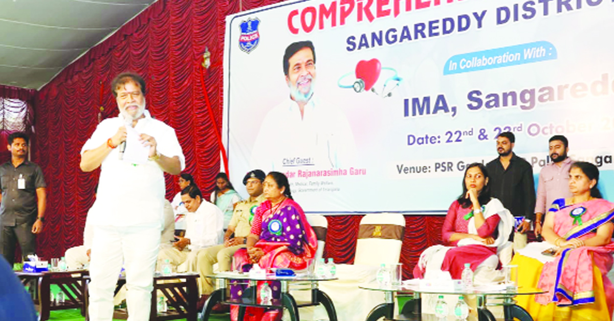 రాష్ట్రంలోని ప్రజలందరికీ ప్రభుత్వ ఆస్పత్రుల్లో కార్పొరేట్ వైద్యం అందించడం ప్రభుత్వ ధ్యేయమని వైద్యారోగ్య శాఖ మంత్రి దామోదర రాజనర్సింహ అన్నారు. బుధవారం సంగారెడ్డి జిల్లా కేంద్రంలోని పీఎస్ఆర్ గార్డెన్లో పోలీసులు, వారి కుటుంబ సభ్యులకు ఉచిత హెల్త్ క్యాంపును మంత్రి ప్రారంభించారు. స్వయంగా మంత్రి వైద్య పరీక్షలు చేయించుకున్నారు. ఈ సందర్బంగా ఏర్పాటు చేసిన సమావేశంలో మంత్రి మాట్లాడుతూ.. సమాజ బాధ్యతతో ప్రజల ఆరోగ్యం, విద్య, వైద్యానికి ప్రభుత్వం ఎంతో ప్రాధాన్యత ఇస్తున్నట్టు చెప్పారు. గ్రామీణ ప్రాంతం నుంచి పట్టణ ప్రాంతాల వరకు ఆరోగ్య వ్యవస్థను బలోపేతం చేస్తున్నట్టు తెలిపారు.