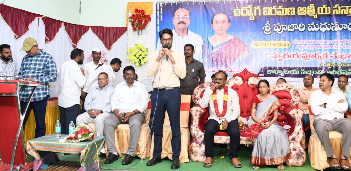 పూజారి మధుసూదన్ రావు నీటి పారుదల శాఖలో కార్యనిర్వహక ఇంజనీరుగా తన బాధ్యతలను సమర్థవంతంగా నిర్వర్తించి వనపర్తి జిల్లా రైతులకు సాగు నీరు అందించడంలో తన వంతు కృషి చేశారని జిల్లా కలెక్టర్ ఆదర్శ్ సురభి అభినందించారు. శుక్రవారం సాగునీటి పారుదల శాఖ ఈఈ పూజారి మధుసూదన్ రావు ఉద్యోగ విరమణ కార్యక్రమం వనపర్తి పట్టణంలోని యం.బి. గార్డెన్ ఫంక్షన్ హాల్లో నిర్వహించగా జిల్లా కలెక్టర్ ముఖ్య అతిథిగా పాల్గొన్నారు.