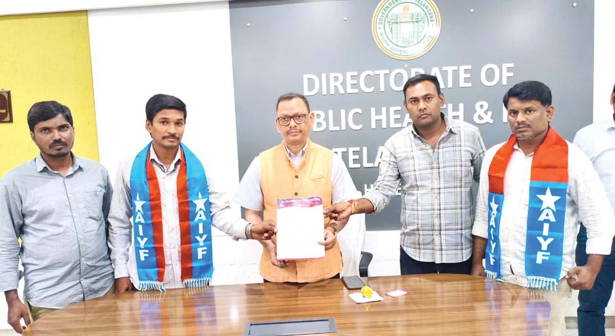 ప్రభుత్వాస్పత్రుల్లో మందుల కొరత లేకుండా చూడాలనీ, ఆరోగ్య రంగాన్ని కార్పొరేట్లకు అప్పగించే కుట్రను ఆపాలని రాష్ట్ర ప్రభుత్వాన్ని ఏఐవైఎఫ్ డిమాండ్ చేసింది. ఈ మేరకు బుధవారం హైదరాబాద్లో ప్రజారోగ్య సంచాలకులు బి.రవీంద్రనాయక్కు వినతిపత్రాన్ని అందజేసింది. ప్రభుత్వాస్పత్రుల్లో జ్వరం, షుగర్, బీపీ వంటి సాధారణ వ్యాధులకు అవసరమైన ప్రాథమిక మందులు కూడా లేవని రవీంద్రనాయక్ దృష్టికి ఏఐవైఎఫ్ రాష్ట్ర ప్రధాన కార్యదర్శి కల్లూరు ధర్మేంద్ర తీసుకెళ్లారు. అత్యవసర మందుల లేమితో రోగులు ఇబ్బంది పడుతున్న తీరును ఉదహరణలతో వివరించారు. ప్రభుత్వాస్పత్రుల్లో డాక్టర్లు ఇచ్చే మందుల చీటీలను తీసుకుని ప్రయివేటు మెడికల్ షాపుల్లో కొనుక్కోవాల్సిన పరిస్థితి వచ్చిందని వాపోయారు. ఇది పేదలపై ఆర్థిక దాడి మాత్రమే కాకుండా వారి ఆరోగ్య హక్కులను బహిరంగంగా తుంగలో తొక్కడమేనన్నారు. ప్రభుత్వ ఆస్పత్రుల్లో మందుల కొరతపై జ్యూడీషియల్ విచారణ జరపాలని డిమాండ్ చేశారు. మందుల కొనుగోలు, సరఫరాలో జరిగిన అవినీతిపై బాధ్యులపై క్రిమినల్ కేసులు నమోదు చేసి కఠిన చర్యలు తీసుకోవాలని డిమాండ్ చేశారు. ప్రభుత్వ ఆరోగ్య వ్యవస్థను బలోపేతం చేసి, ప్రతి పౌరుడికీ ఉచిత, నాణ్యమైన వైద్యం హక్కుగా అమలు చేయాలని కోరారు. ప్రభుత్వం వెంటనే స్పందించి సమస్యను పరిష్కరించకపోతే, ఏఐవైఎఫ్ ఆధ్వర్యంలో రాష్ట్రవ్యాప్తంగా నిరసనలు చేపడుతామని హెచ్చరిం చారు. కార్యక్రమంలో ఏఐవైఎఫ్ రాష్ట్ర కార్యనిర్వాహాక అధ్యక్షులు నేర్లకంటి శ్రీకాంత్, రాష్ట్ర ఉపాధ్యక్షులు టి.సత్య ప్రసాద్, రాష్ట్ర సమితి సభ్యులు షేక్ మహమూద్ పాల్గొన్నారు.