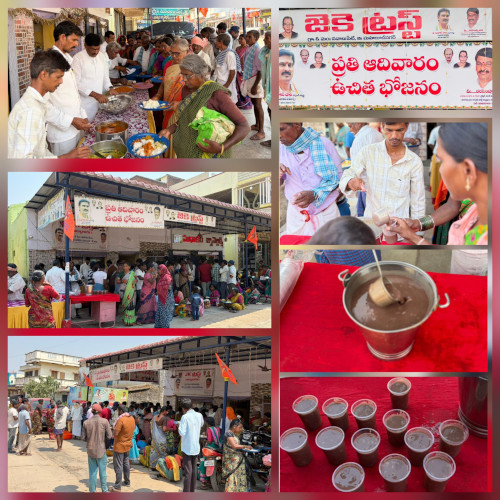 మండల కేంద్రములో జేకే ట్రస్ట్ ఆధ్వర్యంలో గత 82 వారాలుగా ఆదివారం జరిగే సంతకు వచ్చే చుట్టుపక్కల ఉన్న గ్రామాల, తాండాల ప్రజలకు జేకే ట్రస్ట్ చైర్మన్ నర్సింహ చారి మధ్యాహ్న భోజనం ఏర్పాటు చేసి ఆకలి తీరుస్తున్నారు. దీంతో పాటు వేసవి కాలంలో ప్రజల దాహార్తిని తీర్చడానికి రాగి అంబలి కూడా పంపిణీ చేశారు. ఈ సందర్భంగా ట్రస్ట్ చైర్మన్ నర్సింహ చారి మాట్లాడుతూ.. తమ ట్రస్ట్ ద్వారా సేవా కార్యక్రమాలు నిర్వహించి ప్రజా సేవ చేయడమే ట్రస్ట్ లక్ష్యం అని తెలిపారు. ఈ కార్యక్రమంలో ట్రస్ట్ సభ్యులు సుధాకర్ చారి పుట్టి అంజయ్య కృష్ణయ్య నిరంజన్ మహేష్ కుటుంబ సభ్యులు తదితరులు పాల్గొన్నారు.