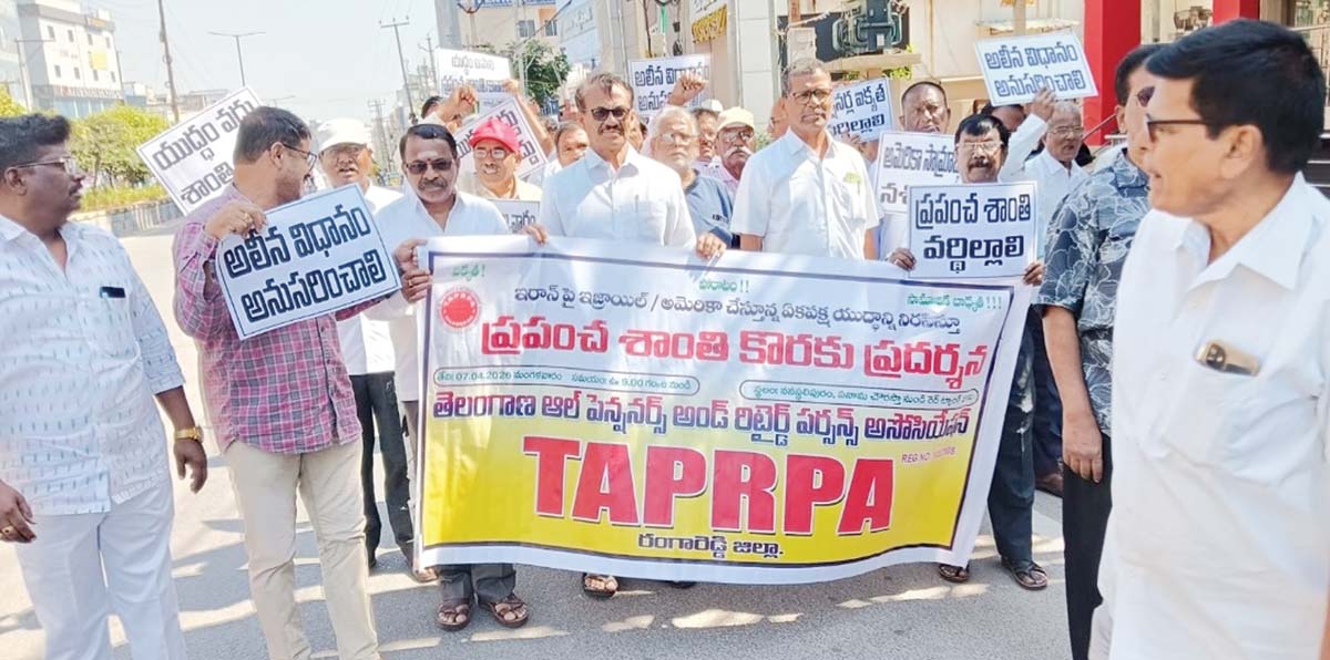 పశ్చిమ ఆసియా దేశాల్లో యుద్ధం కారణంగా అనేక ఇబ్బందులు తలెత్తుతున్నాయని, ఎంతో మంది ప్రాణాలు కోల్పోతున్నారని మాజీ ఎమ్మెల్సీ అలుగుబెల్లి నర్సిరెడ్డి అన్నారు. పెన్షన్ సంఘాల ఆధ్వర్యంలో హైదరాబాద్ వనస్థలిపురంలో యుద్ధ వ్యతిరేక ర్యాలీ నిర్వహించారు. పనామా నుంచి రెడ్ ట్యాంకు వరకు ర్యాలీని నర్సిరెడ్డి ప్రారంభించారు. ‘యుద్ధం వద్దు… ప్రపంచ శాంతి ముద్దు’ అనే నినాదాలతో పెద్ద ఎత్తున ర్యాలీ కొనసాగింది. ఈ సందర్భంగా ఆయన మాట్లాడుతూ.. తక్షణమే యుద్ధ విరమణ చేసి శాంతిని నెలకొల్పాలని డిమాండ్ చేశారు. యుద్ధ ప్రభావంతో దేశంలో వస్తువుల ధరలు పెరుగుతున్నాయని, దీనివల్ల ఆర్థిక పరిస్థితులు దెబ్బతింటున్నాయని ఆందోళన వ్యక్తం చేశారు. హోటళ్ల నిర్వహణ కష్టంగా మారిందని, గ్యాస్ సరఫరా సమస్యలతో ప్రజలు ఇబ్బందులు పడుతున్నారని అన్నారు. యుద్ధానికి వ్యతిరేకంగా ప్రజా చైతన్యం కల్పించాలని పిలుపునిచ్చారు. ఇరాన్ అణు ఆయుధాలు తయారు చేస్తోందని అమెరికా అధ్యక్షులు ట్రంప్ తప్పుడు ప్రచారం చేసి యుద్ధం కొనసాగిస్తున్నారని ఆరోపించారు. ఈ పరిణామాలతో ప్రపంచ శాంతి భంగమవుతోందన్నారు. ఈ కార్యక్రమంలో పెన్షన్ అసోసియేషన్ జిల్లా అధ్యక్షులు కృష్ణారావు, కార్యదర్శి నోముల సుదర్శన్రెడ్డి, బ్రహ్మచారి, అనసూయ, బీజీఎం రెడ్డి, కీసరి నర్సిరెడ్డి, ముషం నరహరి తదితరులు పాల్గొన్నారు.