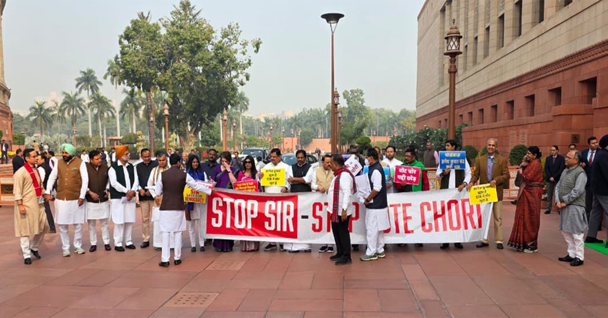 నవతెలంగాణ-హైదరాబాద్: పార్లమెంట్లో వెంటనే ‘SIR’పై చర్చ చేపట్టాలని విపక్షాలు డిమాండ్ చేశాయి. ఈ మేరకు పార్లమెంట్ భవన్ ఎదుట ప్రతిపక్ష సభ్యులంతా ప్లకార్డులు పట్టుకుని ‘సర్’కు వ్యతిరేకంగా నినాదాలు చేశారు. కాంగ్రెస్ అధ్యక్షుడు మల్లిఖార్జున ఖర్గే, సోనియాగాంధీ, రాహుల్ గాంధీ, ప్రియాంకాగాంధీ, విపక్ష ఎంపీలంతా నిరసనల్లో పాల్గొన్నారు. తక్షణమే ‘SIR’ను నిలిపివేయాలని కోరారు.