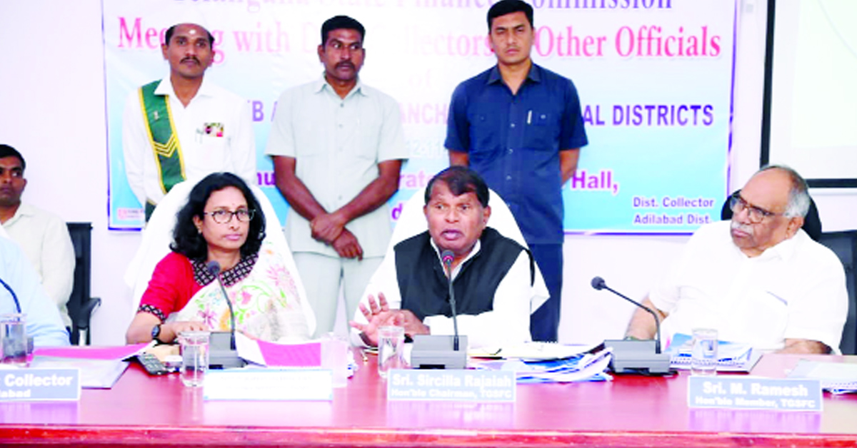 స్థానిక సంస్థల ఆర్థిక స్థితి బలోపేతం కావడం ద్వారానే గ్రామీణాభివృద్ధి వేగవంతమవుతుందని రాష్ట్ర ఫైనాన్స్‌ కమిషన్‌ చైర్మెన్‌ సిరిసిల్ల రాజయ్య అన్నారు. ఆదిలాబాద్‌ కలెక్టరేట్‌ సమావేశ మందిరంలో బుధవారం ఫైనాన్స్‌ కమిషన్‌ సభ్యులు రమేష్‌, కార్యదర్శి కాత్యాయినిదేవి, ఉమ్మడి ఆదిలాబాద్‌ జిల్లా కలెక్టర్లు, డీసీసీబీ చైర్మెన్‌ అడ్డి భోజారెడ్డి, అదనపు కలెక్టర్లు, స్థానిక సంస్థల ప్రతినిధులు, సంబంధిత శాఖల అధికారులతో సమీక్షా సమావేశం నిర్వహించారు. ఈ సందర్భంగా చైర్మెన్‌ మాట్లాడుతూ.. తెలంగాణలోని అన్ని జిల్లాల్లో ఆర్థిక పరిస్థితులను తెలుసుకోవడానికి కమిషన్‌ పర్యటిస్తుందన్నారు. పరిపాలన సౌలభ్యం కోసం రాజ్యాంగాన్ని సవరించి ఫైనాన్స్‌ కమిషన్‌ను ఏర్పాటు చేశారని, దానికి అనుగుణంగా కమిషన్‌ పని చేస్తుందని తెలిపారు. నిర్లక్ష్యానికి గురవుతున్న గ్రామపంచాయతీల గురించి తెలుసుకుంటూ వాటి అభివృద్ధికి ప్రత్యేక నిధులు కేటాయిస్తున్నట్టు చెప్పారు.