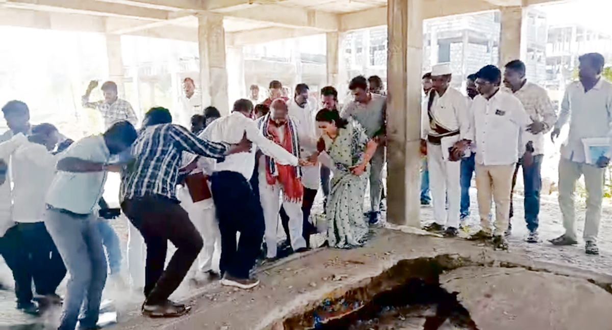 ప్రభుత్వ విప్, వేములవాడ ఎమ్మెల్యే ఆది శ్రీనివాస్, ఇన్చార్జి కలెక్టర్ గరీమ అగ్రవాల్కు తృటిలో ముప్పు తప్పింది. రాజన్న సిరిసిల్ల జిల్లా వేములవాడ మున్సిపల్ పరిధిలో డబుల్ బెడ్రూమ్ ఇండ్ల నిర్మాణ పనులను ఎమ్మెల్యే, కలెక్టర్, అధికారులు, నాయకులు మంగళవారం పరిశీలించారు. ఈ క్రమంలో వారు నిలబడిన ప్రాంతంలోనే బేస్మెంట్ కుంగిపోయింది. బీఆర్ఎస్ ప్రభుత్వం హయాంలో ప్రారంభమైన 144 డబుల్ బెడ్రూమ్ ఇండ్ల నిర్మాణాలు మధ్యలోనే నిలిచిపోయిన విషయం తెలిసిందే. నిర్మాణ నాణ్యతపై అనుమానాలు వ్యక్తమవుతుండగా, తాజాగా ఆ పనులు పున్ణప్రారంభమయ్యాయి. ఈ నేపథó్యంలో అధికారులతో కలిసి పరిశీలనకు వెళ్లిన ఎమ్మెల్యే ఆది శ్రీనివాస్, కలెక్టర్ గరీమ అగ్రవాల్ బేస్మెంట్పై నిలిచి ఉండగా.. అది ఒక్కసారిగా కిందకి కుంగడం కలకలం రేపింది. వెంటనే అధికారులు అప్రమత్తమై అందరినీ అక్కడి నుంచి పక్కకు పంపించారు. ఈ ఘటనతో డబుల్ బెడ్రూమ్ ఇండ్ల నిర్మాణ నాణ్యతపై మళ్లీ ప్రశ్నలు తలెత్తుతున్నాయి.