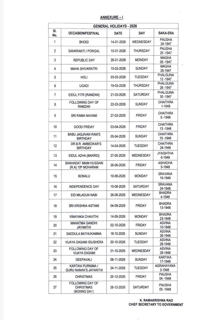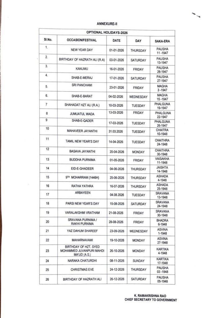 నవతెలంగాణ-హైదరాబాద్: 2026 ఏడాదికి గాను సాధారణ, ఐచ్ఛిక సెలవుల జాబితాను తెలంగాణ ప్రభుత్వం ఖరారు చేసింది. 2026లో మొత్తంగా 27 సాధారణ సెలవులు, 26 ఐచ్ఛిక సెలవులు ఉన్నట్లు రాష్ట్ర ప్రభుత్వం ప్రకటించింది. ఈ మేరకు రాష్ట్ర ప్రభుత్వ ప్రధాన కార్యదర్శి రామకృష్ణారావు ఉత్తర్వులు జారీ చేశారు.