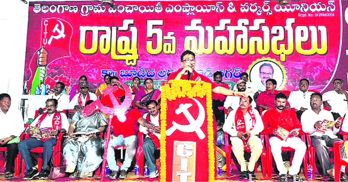 కేంద్ర ప్రభుత్వం అనుసరిస్తున్న కార్మిక వ్యతిరేక చట్టాలు.. సంఘటిత, అసంఘటిత కార్మికులకు గొడ్డలి పెట్టు అని సీఐటీయూ రాష్ట్ర ప్రధాన కార్యదర్శి పాలడుగు భాస్కర్‌ అన్నారు. మహబూబాబాద్‌ జిల్లా గార్లలో తెలంగాణ గ్రామ పంచాయతీ ఎంప్లాయీస్‌ అండ్‌ వర్కర్స్‌ యూనియన్‌ (సీఐటీయూ) రాష్ట్ర 5వ మహాసభలు శుక్రవారం అట్టహాసంగా ప్రారంభమ య్యాయి. ముందుగా స్దానిక సీఐటీయూ కార్యాలయం నుంచి ఏవీఆర్‌ ఫంక్షన్‌హాల్‌ వరకు భారీ ప్రదర్శన నిర్వహించారు. అనంతరం ఏవీఆర్‌ ఫంక్షన్‌ హల్‌లో యూనియన్‌ రాష్ట్ర అధ్యక్షులు గ్యారా పాండు అధ్యక్షతన జరిగిన బహిరంగసభ నిర్వహించారు. యూనియన్‌ జెండాను సంఘం రాష్ట్ర అధ్యక్షులు గ్యారా పాండు ఆవిష్కరించారు. బహిరంగ సభ ప్రాంగణంలో సీనియర్‌ నాయకులు అమరజీవి బూడిద అరుణ్‌ గౌడ్‌ చిత్ర పటానికి పాలడుగు భాస్కర్‌, నాయకులు వంగూరి రాములు, మండల కన్వీనర్‌ కందునూరి శ్రీనివాస్‌, నాయకులు అలవాల రామకృష్ణ పూలమాలలు వేసి ఘనంగా నివాళులు అర్పించారు.