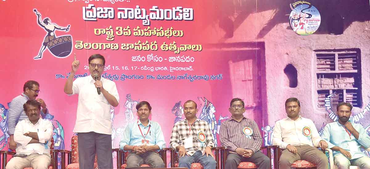 భక్తిని నటిస్తున్న వారి కుయుక్తులపై ప్రజా నాట్య మండలి పాటలు పాడాలనీ, భజనలు చేయాలని పిలుపునిచ్చారు. భక్తి పేరుతో ప్రతి పండుగను హైజాక్ చేస్తున్న వారికి వ్యతిరేకంగా ఆ పండుగల సందర్భంగా ప్రత్యామ్నాయ సాంస్కృతిక ఉత్సవాలు నిర్వహించాలని సూచించారు. శ్రమ జీవులపై అనేక భారాలు వేస్తున్న వారు… అదే శ్రామికులు పండించిన పంటను కోసిన సందర్భంలో పండుగను చేసుకుంటున్నాయని తెలిపారు. మతం, భక్తి అనేవి సాటి మనిషిని దయతో చూడాలని చెబుతుంటాయనీ, ద్వేషాన్ని చూపే వారు నియంతలే అవుతారని విమర్శించారు. శాంతిని కోరుకునే వారే నిజమైన కళాకారులని వ్యాఖ్యానించారు.ఆకట్టుకున్న కళా ప్రదర్శనలు ప్రజా నాట్యమండలి రాష్ట్ర మహాసభలు, తెలంగాణ జానపద ఉత్సవాల ప్రారంభ సభ సందర్భంగా వివిధ జిల్లాల కళాకారులు చేపట్టిన ప్రదర్శనలు ఆకట్టుకున్నాయి. పాడుదమా స్వేచ్ఛాగీతం పాట, నల్లగొండ జిల్లా ప్రసాద్ ఆటా పాట, సాయి భజన బృందం, సూర్యాపేట కళాకారుల డప్పుల వాయిద్య ప్రదర్శనలు అలరించాయి.