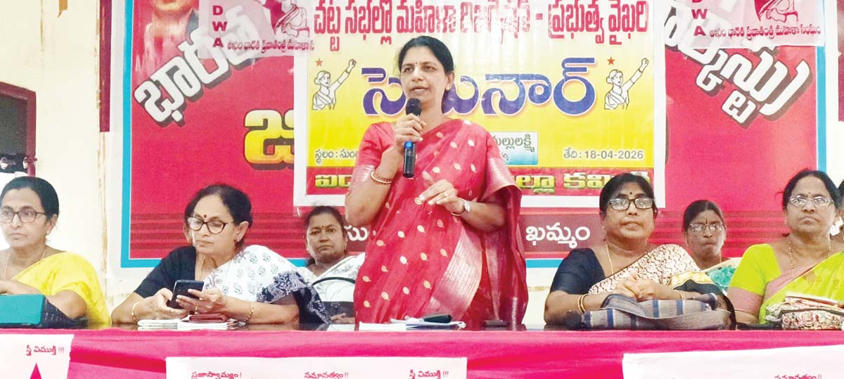 ‘2014లోనే తేవాల్సిన మహిళా రిజర్వేషన్ బిల్లును మరుగున పడేటట్టు కేంద్రం చేసింది. 2023లో పార్లమెంటులో పాస్ చేసిన అప్పుడున్న బీజేపీ ప్రభుత్వం దాటవేసి ఇప్పుడు రాజకీయ లబ్ది కోసం మహిళా రిజర్వేషన్ బిల్లును స్వార్థపూరితంగా వాడుకోవాలని చూసింది. పార్లమెంటులో ప్రవేశపెట్టిన మహిళా రిజర్వేషన్ బిల్లును ప్రతిపక్షాలన్నీ వ్యతిరేకిస్తున్నా, ఓటింగ్ ప్రతిపాదన పెట్టడం సిగ్గుచేటు. మహిళా రిజర్వేషన్ బిల్లుకు, డీలిమిటేషన్కు సంబంధం లేకపోయినా వాటికి లింక్ పెట్టడంలో ఉద్దేశం ఏమిటి. డిలిమిటేషన్ వల్ల దక్షిణాది రాష్ట్రాలకు అన్యాయం జరిగే విధంగా ఉంది’ అని ఐద్వా రాష్ట్ర కార్యదర్శి మల్లు లక్ష్మి అన్నారు. శనివారం ఖమ్మంలోని సుందరయ్య భవనంలో ఐద్వా ఖమ్మం జిల్లా కమిటీ ఆధ్వర్యంలో చట్ట సభలలో ‘మహిళా రిజర్వేషన్ ప్రభుత్వ వైఖరి’ అనే అంశంపై ఐద్వా జిల్లా అధ్యక్షురాలు మెరుగు రమణ అధ్యక్షతన సెమినార్ జరిగింది. డీలిమిటేషన్ వల్ల మహిళలకు అన్యాయమే జరుగుతుంది తప్ప న్యాయం జరగదు అని అన్నారు. మహిళలపై జరిగే అన్యాయాలను అరికట్టి చట్టాలను పకడ్బందీగా అమలు చేసి, ఇంటా బయట సమాన హక్కులు, సమాన హోదా కల్పించి చట్ట సభలలో కూడా మహిళా ప్రాతినిధ్యాన్ని పెంపొందించిన నాడే నిజమైన మహిళా రిజర్వేషన్ బిల్ ఆమోదయోగ్యమవుతుందని అన్నారు. ఐద్వా రాష్ట్ర ఉపాధ్యక్షురాలు బుగ్గవీటి సరళ మాట్లాడుతూ మహిళలపై అణిచివేతను దాడులను అసమానతులను అరికట్టిన నాడే మహిళలు స్వేచ్ఛగా ఉండగలరని అన్నారు.