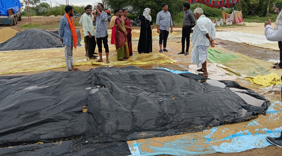 మండలంలో శనివారం కురిసిన భారీ వర్షానికి రైతులు ఆరబోసిన ధాన్యం తడిసి ముద్దయింది. ధాన్యం కొనుగోలు కేంద్రాలలో ఆరబోసుకున్న ధాన్యం తడిసి ముద్దవ్వడంతో రైతులు తీవ్ర ఆందోళన చెందారు. ఒక గంటలో తమ ధాన్యం తరలిస్తామన్న రైతన్నల ఆశలు అడియాశలయ్యాయి. ఈ విషయం తెలిసిన వెంటనే స్థానిక తహసిల్దార్ శ్రవణ్ కుమార్ సంఘటన స్థలానికి విచ్చేసి పరిశీలించారు. గత రెండు మూడు సంవత్సరాలుగా రైతులకు వర్షాభావ పరిస్థితులతో తీవ్ర ఇబ్బందులు కాల్చి వస్తుంది. గత సంవత్సరం పొగాకు పండించిన రైతులకు తీవ్ర నష్టం వాటిల్లగా.. రైతులు సోయ పంటను వేయగా అట్టి పంట నీట మునిగి రైతులకు దెబ్బ మీద దెబ్బ పడితే అప్పుల పాలవుతున్నారు. ప్రభుత్వం రైతాంగాన్ని ఆదుకోవాలని వారి కోరుతున్నారు.