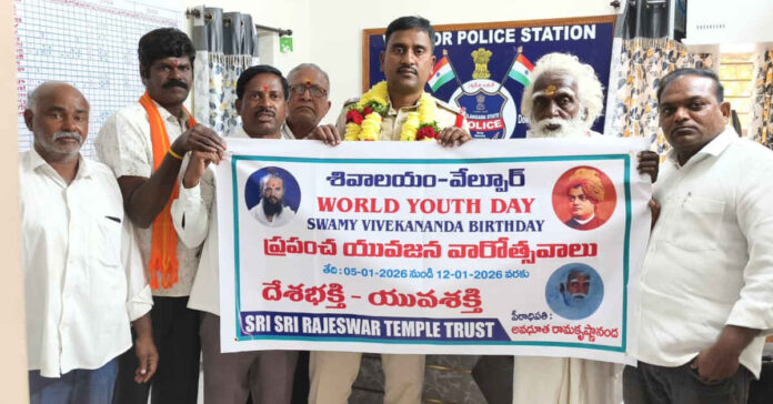 మండల కేంద్రంలోని శివాలయంలో నిర్వహించ తలపెట్టిన ప్రపంచ యువజన వారోత్సవాల పోస్టర్ ను సోమవారం పోలీస్ స్టేషన్ యందు ఎస్సై బి. సంజయ్ ఆవిష్కరించారు. ఈ సందర్భంగా అవధూత రామకృష్ణ స్వామి, ధర్మ ప్రచారకుడు కంకణాల రాజేశ్వర్ మాట్లాడుతూ స్వామి వివేకానంద జయంతిని వేల్పుర్ శివాలయంలో ఘనంగా నిర్వహించనున్నట్లు తెలిపారు. దేశభక్తిని పెంపొందిస్తూ యువశక్తితో ముందుకు తీసుకుపోవాల్సిన ఆవశ్యకతను తెలిపారు. ఈ సత్కార్యంలో శివాలయం కమిటీ చైర్మన్ పన్నాల రాజేశ్వర్ రెడ్డి, సలహాదారుడు బొంపల్లి గంగాధర్ గుప్తా, రామ్మోహన్, పాకాల దశాగౌడ్, వడ్నాల రమేశ్, పత్తి రాజ్ కుమార్, గంగారెడ్డి తదితరులు పాల్గొన్నారు.