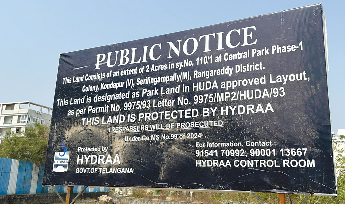 హైదరాబాద్ నగరంలో వేర్వేరు ప్రాంతాల్లో ప్రభుత్వ, ప్రజావసరాలకు సంబంధించిన 11 ఎకరాల భూమిని హైడ్రా కాపాడింది. మార్కెట్లో దాని విలువ రూ.1650 కోట్లు ఉంటుందని అంచనా. ఇందులో 2 ఎకరాలు పార్కు కోసం కేటాయించినది కాగా, 5 ఎకరాలు శ్మశాన వాటికతోపాటు 4 ఎకరాలు డంప్ యార్దుకు చెందినది ఉంది. రంగారెడ్డి జిల్లా శేరిలింగంపల్లి మండలం కొండాపూర్ గ్రామంలోని సెంట్రల్ పార్కు కాలనీలో పార్కు కోసం 2 ఎకరాలు కేటాయించారు. సర్వే నెంబరు 110/1లో 148 ప్లాట్లతో 16 ఎకరాల మేర సెంట్రల్ పార్కు కాలనీ ఫేజ్-1 పేరుతో 1998లో లేఔట్ వేశారు. ఇందులో 2 ఎకరాలను పార్కు కోసం కేటాయించగా, మున్సిపల్ అధికారులు హద్దులు నిర్ధారించి ప్రహరీ కూడా నిర్మించారు. కానీ, ఆ స్థలం తమదంటూ కొంతమంది ఆక్రమణలకు పాల్పడటం, కాలనీ వాళ్లు అడ్డుకుంటే వారిని బెదిరించడం వంటి ఘటనలు పలుమార్లు జరిగాయి. దీనిపై హైడ్రా ప్రజావాణిలో వచ్చిన ఫిర్యాదు మేరకు రెవెన్యూ, జీహెచ్ఎంసీ అధికారులతో కలిసి క్షేత్రస్థాయిలో పరిశీలించింది. రెండెకరాలు పార్కు స్థలంగా నిర్ధారించింది. పార్కులో తాత్కాలికంగా వేసిన షెడ్లను హైడ్రా కమిషనర్ ఏవీ రంగనాథ్ ఆదేశాల మేరకు అధికారులు మంగళవారం ఉదయం తొలగించారు. రెండెకరాల చుట్టూ ఫెన్సింగ్ ఏర్పాటు చేశారు. పార్కు స్థలంగా పేర్కొంటూ హైడ్రా బోర్డు ఏర్పాటు చేశారు.