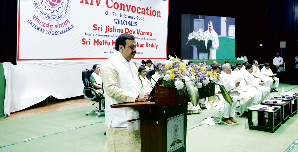 హైదరాబాద్‌ కూకట్‌పల్లిలోని జేఎన్టీయూ హెచ్‌ ఆడిటోరియంలో శనివారం 14వ స్నాతకోత్సవ కార్యక్రమాన్ని ఘనంగా నిర్వహిం చారు. ఈ స్నాతకోత్సవంలో మొత్తం 82,547 మంది విద్యార్థులకు యూజీ, పీజీ, పీహెచ్‌డీ డిగ్రీలు ప్రదానం చేశారు. ఇందులో 15 విభాగాల నుంచి 87 డాక్టరల్‌ డిగ్రీలు, 71 బంగారు పతకాలు ఉన్నాయి. ఈ కార్యక్రమానికి జేఎన్టీయూ హెచ్‌ వీసీ డా.టి.కిషన్‌ కుమార్‌రెడ్డి అధ్యక్షత వహించి స్నాతకోత్సవాన్ని ప్రారంభించారు. ముందుగా అరబిందో ఫార్మా లిమిటెడ్‌, హైదరాబాద్‌ హోల్‌టైమ్‌ డైరెక్టర్‌ మెట్టు మదన్‌ మోహన్‌రెడ్డికి డాక్టరేట్‌ (ఆనరిస్‌ కాజా) ప్రదానం చేశారు. ఆయన సైన్స్‌ అండ్‌ టెక్నాలజీ, ఫార్మాస్యూటికల్‌ రంగాల్లో చేసిన విశిష్ట సేవలు, నాయకత్వ ప్రతిభకు గుర్తింపుగా ఈ గౌరవాన్ని అందజేశారు. వీసీ విద్యార్థులతో ప్రమాణం చేయిం చి డిగ్రీలను ప్రదానం చేశారు. అనంతరం ఆయన విశ్వవిద్యాలయ వార్షిక నివేదికను సమర్పిస్తూ మాట్లాడారు.