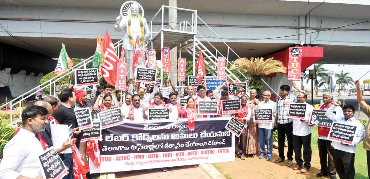 కేంద్రంలోని బీజేపీ ప్రభుత్వం తీసుకొచ్చిన నాలుగు లేబర్‌ కోడ్‌లను రద్దు చేయాలనీ, వాటిని రాష్ట్రంలో అమలు చేయబోమంటూ అసెంబ్లీలో తీర్మానం చేయాలని కేంద్ర, రాష్ట్ర కార్మిక సంఘాలు డిమాండ్‌ చేశాయి. నాలుగు లేబర్‌ కోడ్‌లకు వ్యతిరేకంగా దేశవ్యాప్తంగా కార్మిక వర్గం తమ నిరసనలను వ్యక్తం చేస్తోందని తెలిపాయి. లేబర్‌ కోడ్‌ల అంశంపై శనివారం హైదరాబాద్‌ లోయర్‌ ట్యాంక్‌బండ్‌లోని అంబేద్కర్‌ విగ్రహం వద్ద కార్మిక సంఘాలు నిరసన కార్యక్రమాన్ని చేపట్టాయి. ఈ సందర్భంగా సంఘాల నేతలు మాట్లాడుతూ..కేంద్రం తీసుకొచ్చిన నాలుగు లేబర్‌ కోడ్‌లను రద్దు చేయాలని డిమాండ్‌ చేశారు. మోడీ ప్రభుత్వ కార్మిక వ్యతిరేక విధానాలు నశించాలని నినాదాలు చేశారు. రాహుల్‌ గాంధీ, పీసీసీ అధ్యక్షులు మహేశ్‌కుమార్‌ గౌడ్‌ నాలుగు లేబర్‌ కోడ్‌లను వ్యతిరేకించారని గుర్తు చేశారు.