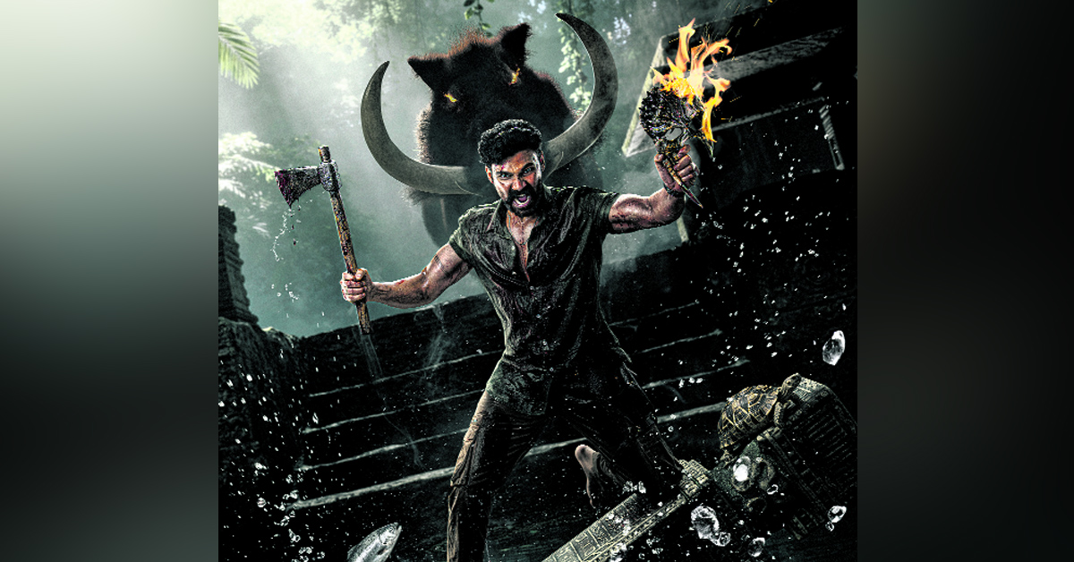 ఫెరోషియస్ మాస్ లుక్లో ఉన్న సాయి శ్రీనివాస్ సగం నీటిలో మునిగి ఉన్న ఒక పురాతన కట్టడంపై నిలబడి, అతని శరీరం నీటితో తడిసి, రక్తపు మరకలతో కనిపించడం ఆసక్తికరంగా ఉంది. ఒక చేతిలో రక్తంతో తడిసిన గొడ్డలిని పట్టుకుని, మరో చేతిలో మండుతున్న ముసుగు, అతని వెనుక మెరిసే కళ్ళు భారీ కోరలతో ఉన్న ఒక పెద్ద వరాహం కనిపించడం ఇంటన్సిటీని మరింత పెంచింది.