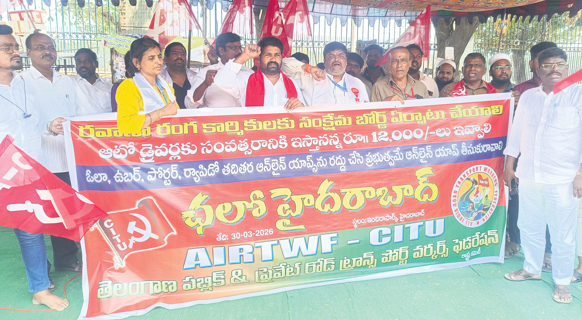 రవాణా రంగ కార్మికులకు సంక్షేమ బోర్డు ఏర్పాటు చేయాలని, ఎన్నికల్లో కాంగ్రెస్ ఇచ్చిన హామీలు వెంటనే అమలు చేయాలని ఏఐఆర్టీడబ్యూఎఫ్(సీఐటీయూ) రాష్ట్ర ప్రధాన కార్యదర్శి పుప్పాల శ్రీకాంత్ డిమాండ్ చేశారు. రవాణా రంగ కార్మికుల సమస్యలు పరిష్కరించాలని డిమాండ్ చేస్తూ సోమవారం యూనియన్ ఆధ్వర్యంలో ఇందిరాపార్క్ ధర్నాచౌక్ వద్ద ధర్నా నిర్వహించారు. కార్యక్రమానికి ట్రాన్స్పోర్ట్ ఫెడరేషన్ రాష్ట్ర ఉపాధ్యక్షులు ఎల్.కోటయ్య అధ్యక్షత వహించారు. ఈ సందర్భంగా శ్రీకాంత్ మాట్లాడుతూ.. రాష్ట్ర ప్రభుత్వం ఎన్నికల సమయంలో ఆటో డ్రైవర్లకు సంవత్సరానికి రూ.12,000 ఆర్థిక సహాయం అందిస్తామని ఇచ్చిన హామీని ఇప్పటికీ అమలు చేయకపోవడం దుర్మార్గమన్నారు. నిత్యావసర సరుకుల ధరలు, ఇంధన ధరల భారంతో ఆటో, క్యాబ్ డ్రైవర్లు తీవ్ర ఆర్థిక ఇబ్బందులు ఎదుర్కొంటున్నారని తెలిపారు. ముఖ్యంగా మహాలక్ష్మి స్కీం అమలు కారణంగా ఆటో, క్యాబ్ డ్రైవర్ల ఉపాదికిó తీవ్ర నష్టం కలుగుతోందని, దీనివల్ల వేలాది కుటుంబాలు జీవనోపాధి కోల్పోయే పరిస్థితి ఏర్పడిందని అన్నారు. ప్రభుత్వం తక్షణమే డ్రైవర్లకు నెలకు రూ.4,500 జీవనభృతి ప్రకటించాలని డిమాండ్ చేశారు. పెరుగుతున్న ఇంధన ధరలు, వాహనాల నిర్వహణ ఖర్చులను దృష్టిలో ఉంచుకుని ప్రత్యేక రాయితీలు కల్పించాలని కోరారు. పెట్రోల్, డీజిల్, గ్యాస్ ధరల పెరుగుదలతోపాటు వాహనాల ఈఎంఐలు, ఇన్సూరెన్స్, ఫిట్నెస్, పర్మిట్ ఖర్చులు భారీగా పెరిగాయని తెలిపారు. అదే సమయంలో ఆదాయం తగ్గిపోవడం కార్మికులను తీవ్ర ఇబ్బందులకు గురిచేస్తోందన్నారు.