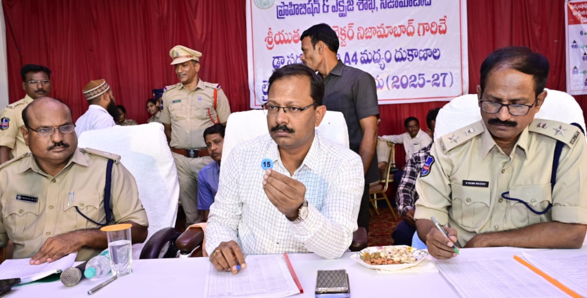 మద్యం దుకాణాల లైసెన్సుల జారీ కోసం సోమవారం నిజామాబాద్ నగర శివారులోని భారతీ గార్డెన్ లో లాటరీ పద్దతిలో వైన్ షాపుల కేటాయింపునకు లక్కీ డ్రా నిర్వహించారు. కలెక్టర్ టి.వినయ్ కృష్ణారెడ్డి నేతృత్వంలో కట్టుదిట్టమైన ఏర్పాట్ల నడుమ ఎలాంటి అవాంతరాలకు తావులేకుండా సాఫీగా ఈ ప్రక్రియ కొనసాగింది. నూతన ఎక్సయిజ్ పాలసీ నియమ, నిబంధనలను అనుసరిస్తూ ఎలాంటి లోటుపాట్లకు తావులేకుండా పక్కాగా ఏర్పాట్లు చేశారు. జిల్లాలోని 102 మద్యం షాపులకు గాను మొత్తం 2786 దరఖాస్తులు దాఖలయ్యాయి. ఒక్కో షాపు వారీగా దాఖలైన దరఖాస్తులకు సంబంధించిన వారిని ఆహ్వానిస్తూ, వారి సమక్షంలో కలెక్టర్ లక్కీ డ్రా తీస్తూ మద్యం దుకాణాల కేటాయింపును ఖరారు చేశారు.