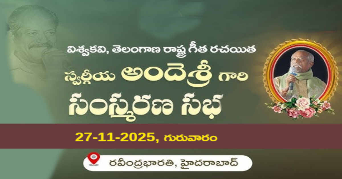 రవీంద్రభారతి సమావేశ మందిరంలో సా. 5 గంటలకు ఉంటుందని సంస్థ అధ్యక్షుడు ఎల్వీ చెన్నారావు తెలిపారు. అందెశ్రీ అభిమానులు తరలి రావలసిందిగా పిలుపునిచ్చారు.