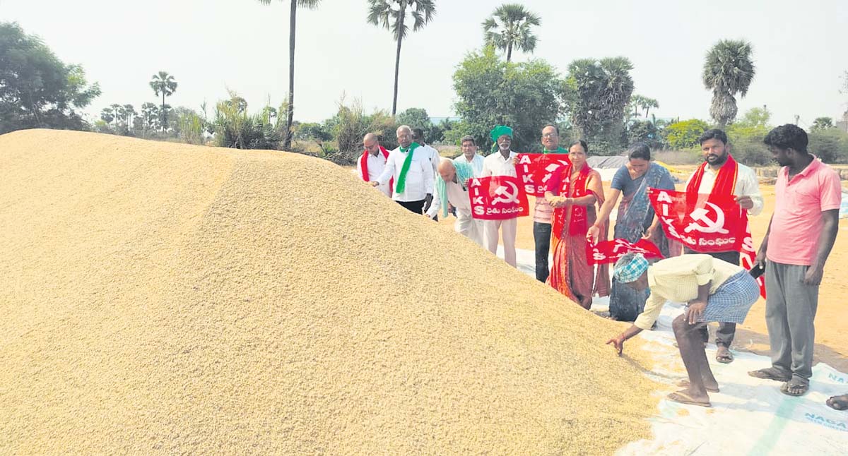 అధికారుల నిర్లక్ష్యం.. మిల్లర్ల దోపిడీతో పంట పండించిన రైతులు ఆగమవుతున్నారని మహిళా రైతు సంఘం రాష్ట్ర కన్వీనర్ కందాల ప్రమీల ఆవేదన వ్యక్తం చేశారు. నల్లగొండ జిల్లా నకిరేకల్ మండలంలోని నెల్లిబండ గ్రామంలో మంగళవారం ధాన్యం కొనుగోలు కేంద్రాన్ని రైతు సంఘం ఆధ్వర్యంలో సందర్శించి పరిశీలించారు. ఈ సందర్భంగా ఆమె మాట్లాడుతూ.. ఆరు శాతం లోపు తాలు ఉన్నా ఎలాంటి ఆటంకమూ కలిగించకుండా ధాన్యాన్ని కొనుగోలు చేయాలన్న నిబంధన ఉన్నా ఖాతరు చేయకుండా క్వింటాకు ఐదు కేజీలు తరుగు తీయడాన్ని తప్పుబట్టారు. కాంటాలు అయిన తర్వాత మిల్లర్లు ధాన్యాన్ని వెంటనే దిగుమతి చేసుకోకపోవడం వల్ల లారీ లోడులో ఐదు నుంచి పది క్వింటాలు అదనంగా తూకం తగ్గిస్తున్నారని ఆగ్రహం వ్యక్తం చేశారు. ధాన్యం కేంద్రాల్లో రైతులను నిలువునా దోచుకుంటున్నా అధికారులు చోద్యం చూస్తున్నారని విమర్శించారు. కేంద్రాలలో దోపిడీని అరికట్టకపోతే పెద్దఎత్తున ఆందోళన నిర్వహిస్తామని హెచ్చరించారు. ఈ పర్యటనలో రైతు సంఘం సీనియర్ నాయకులు బచుపల్లి ప్రకాష్రావు, యానాల క్రిష్ణారెడ్డి, రైతు సంఘం మండల అధ్యక్షులు గింజల లక్ష్మి, నాయకులు వెంకట రంగారెడ్డి, చందు, సైదులు, రైతులు ఉన్నారు.
