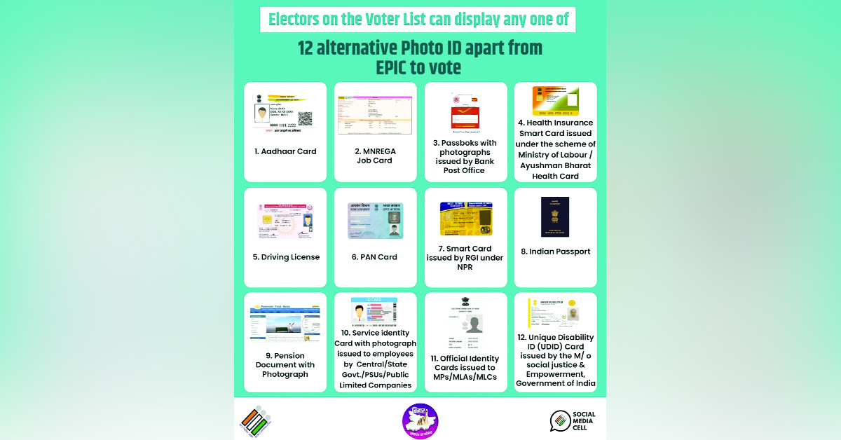 ఓటరు జాబితాలో పేరు ఉండి.. ఓటరు గుర్తింపు కార్డు లేకున్నా పర్వాలేదు.. ఓటర్లు ఎపిక్‌ కార్డు కాకుండా 12 ప్రత్యామ్నాయ ఫొటో ‘ఐడీ’ల్లో దేన్నైనా ప్రదర్శించి ఓటు హక్కు వినియోగించుకోవచ్చని హైదరాబాద్‌ జిల్లా ఎన్నికల అధికారి, జీహెచ్‌ఎంసీ కమిషనర్‌ కర్ణన్‌ ఒక ప్రకటనలో తెలిపారు. నవంబర్‌ 11న జరగనున్న జూబ్లీహిల్స్‌ అసెంబ్లీ నియోజకవర్గ ఉపఎన్నిక పోలింగ్‌లో ఓటు హక్కు వినియోగించుకోవడానికి ఓటరు జాబితాలో ముందుగా పేరును పరిశీలించుకోవాలని సూచించారు. ఓటరు గుర్తింపు కార్డు (ఎపిక్‌ కార్డు) కాకుండా 12 ప్రత్యామ్నాయ ఫొటో ఐడీల్లో దేన్నైనా పోలింగ్‌ సిబ్బందికి చూపి ఓటు హక్కు వినియోగించుకోవచ్చన్నారు.