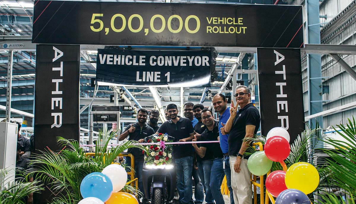 బెంగళూరు : దేశంలోని ప్రముఖ ఎలక్ట్రిక్ ద్విచక్ర వాహన తయారీ సంస్థ ఏథర్ ఎనర్జీ లిమిటెడ్ వాహన ఉత్పత్తిలో నూతన మైలురాయిని చేరినట్లు ప్రకటించింది. తమిళనాడులోని హోసూర్లో ఉన్న తమ తయారీ ప్లాంట్ నుండి 5 లక్షల వాహనాన్ని అందుబాటులోకి తెచ్చినట్లు వెల్లడించింది. 5,00,000 స్కూటర్లను అధిగమించడం ఏథర్కు ఒక ప్రధాన మైలురాయి అని ఆ కంపెనీ సహ వ్యవస్థాపకుడు, సీటీఓ స్వప్నిల్ జైన్ పేర్కొన్నారు. ‘మా మొట్టమొదటి ప్రోటోటైప్ నుండి నేటి వరకు, మా ప్రయాణం కేవలం వాహనాలను నిర్మించడం మాత్రమే కాదు, స్కేలబుల్, నమ్మకమైన, స్థిరమైన తయారీ వ్యవస్థను నిర్మించడంపై దృష్టి సారించింది” అని జైన్ తెలిపారు.