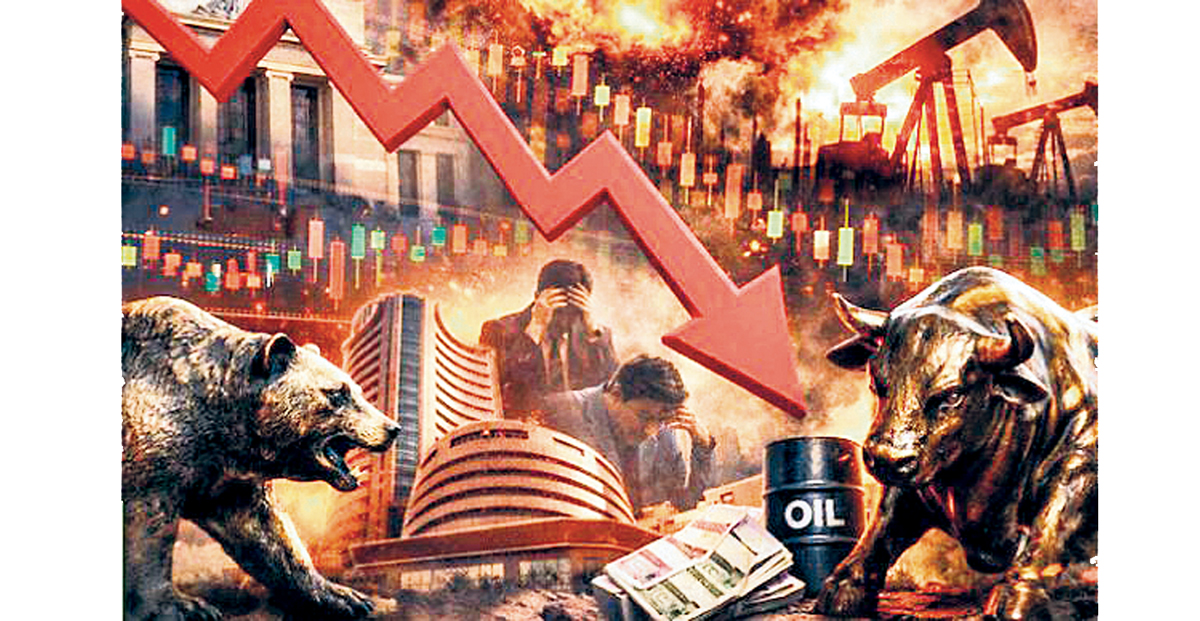 ముంబయి : పశ్చిమాసియాలో అమెరికా యుద్ధ తీవ్రతను పెంచడం దలాల్ స్ట్రీట్లో మళ్లీ ఆందోళనలను పెంచింది. రెండు సెషన్లలో భారీ లాభాలను నమోదు చేసిన మార్కెట్లు.. తిరిగి శుక్ర వారం కుప్పకూలాయి. ముఖ్యంగా ముడి చమురు ధరల పెరుగుదల సూచీలను కుదిపేశాయి. అమ్మకాల ఒత్తిడిలో తుదకు బిఎస్ఇ సెన్సెక్స్ 1,690.23 పాయింట్లు లేదా 2.25 శాతం క్షీణించి 73,583కు పడిపోయింది. ఇంట్రాడేలో ఏకంగా 1,739 పాయింట్ల కనిష్టాన్ని చవి చూసింది. ఎన్ఎస్ఇ నిఫ్టీ కూడా 486.85 పాయింట్లు లేదా 2.09 శాతం నష్టంతో 22,819.60 వద్ద ముగిసింది. బిఎస్ఇ మార్కెట్ కాపిటలైజేషన్ రూ.8 లక్షల కోట్లు పైగా ఆవిరై రూ.422.11 లక్షల కోట్లకు పరిమితమయ్యింది. సెన్సెక్స్లోని దిగ్గజ సంస్థ రిలయన్స్ ఇండిస్టీస్ అత్యధికంగా 4.55 శాతం నష్టపోగా, దానితో పాటు బజాజ్ ఫైనాన్స్, స్టేట్ బ్యాంక్ ఆఫ్ ఇండియా, హెచ్డిఎఫ్సి బ్యాంక్ వంటి అధిక వెయిటేజీ ఉన్న షేర్లు కూడా పతనమయ్యాయి. ప్రతికూల పరిస్థితుల్లోనూ టిసిఎస్, భారతీ ఎయిర్టెల్, పవర్ గ్రిడ్ వంటి కొన్ని షేర్లు లాభాలను నమోదు చేశాయి. అమెరికా-ఇరాన్ మధ్య కొనసాగుతున్న ఉద్రిక్తతలు ఎప్పుడు ముగుస్తాయో తెలియని అనిశ్చితి నెలకొనడం పెట్టుబడిదారులలో ఆందోళన నింపిందని దీనికి తోడు అంతర్జాతీయ మార్కెట్లో బ్రెంట్ క్రూడ్ ఆయిల్ ధర బ్యారెల్కు 109.9 డాలర్లకు చేరడం, భారత రూపాయి విలువ 95 చేరువకు పడిపోవడంతో మార్కెట్లు పతనమయ్యాయి.