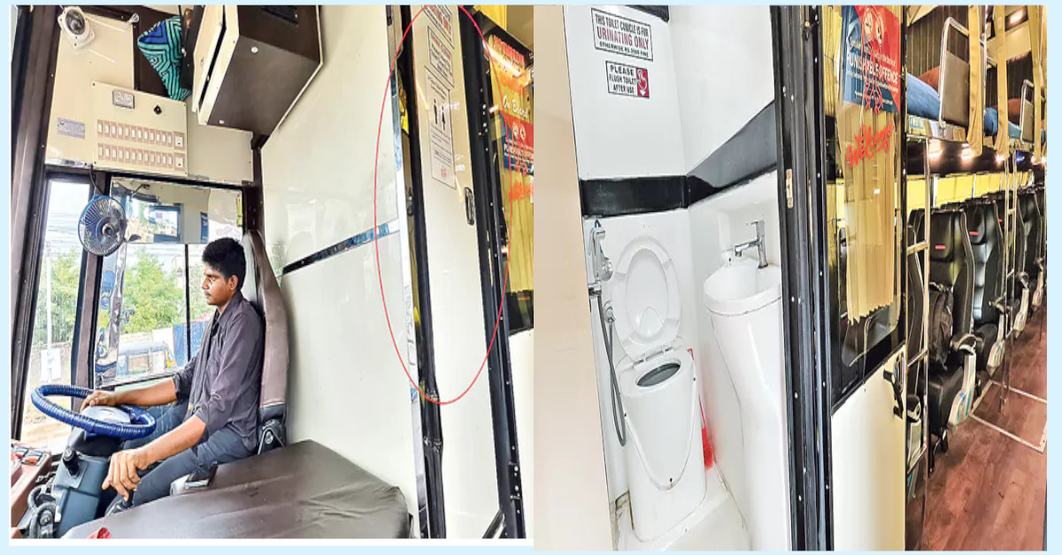 నవతెలంగాణ హైదరాబాద్: దూర ప్రయాణాలకు వెళ్లాలంటే సామాన్యుల మొదటి చాయిస్ రైలే. ఎందుకంటే రైలులోనైలే మరుగుదొడ్లు అందుబాటులో ఉంటాయి. బస్సు ప్రయాణంలో అయితే కనీసం మూత్రవిసర్జనకు వెళ్లాలన్నా డ్రైవరు దగ్గరికి వెళ్లి బస్సు ఆపమని అడగడానికి ఇబ్బంది పడుతుంటారు. ఇలాంటి వారి కోసం ప్రయివేట్ ట్రావెల్స్ సంస్థ అయిన ఇంటర్సిటీ తమ బస్సుల్లో బాత్రూం సదుపాయం కల్పించింది. డ్రైవర్ సీటు వెనుకభాగంలో వెస్టర్న్ కమోడ్, ముఖం కడుక్కోవడానికి వాష్బేసిన్ ఏర్పాటు చేశారు. ప్రస్తుతానికి మూత్రవిసర్జనకు మాత్రమే అనుమతిస్తున్నారు.