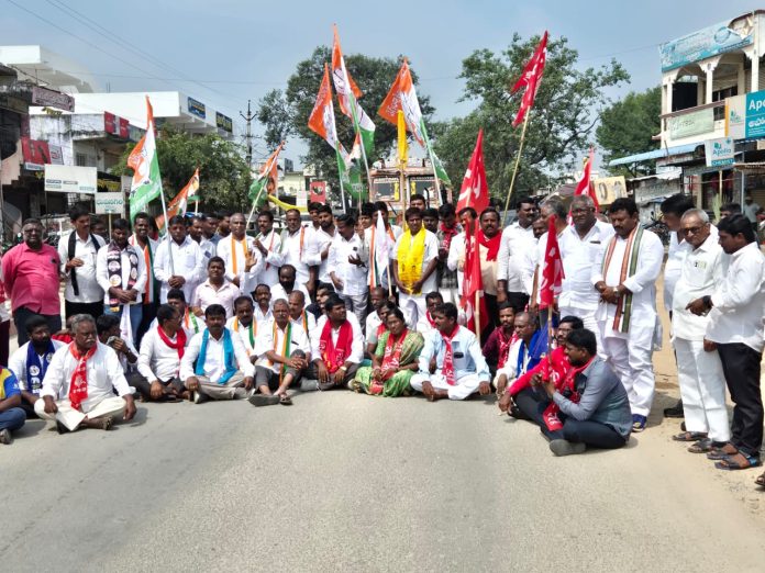 నవతెలంగాణ – వలిగొండ రూరల్: స్థానిక సంస్థల ఎన్నికల్లో బీసీ లకు 42% రిజర్వేషన్లపై రాష్ట్ర వ్యాప్త బంద్ లో బాగంగా మండలకేంద్రంలో కాంగ్రెస్, సీపీఐ(ఎం) పార్టీ, సీపీఐ పార్టీ, బీఎస్పీ పార్టీ, టీడీపీ పార్టీ, పార్టీ ల ఆధ్వర్యంలో మెయిన్ రోడ్డు పై ధర్నా చేపట్టి రాస్తారోకో నిర్వహించారు.ఈ సందర్భముగా పలువురు మాట్లాడుతూ బీసీ లకు 42% రిజర్వేషన్లపై కేంద్ర ప్రభుత్వం లోక సభలో తీర్మానం చేసి చట్ట బద్దత కల్పించి వెంటనే రిజర్వేషన్లు అమలుపర్చి స్థానిక సంస్థల ఎన్నికలునిర్వహించాలని కోరారు. బీజేపీ ఆధ్వర్యంలో మండలకేంద్రంలోని మెయిన్ రోడ్డుపై రాబోయే స్థానిక సంస్థల ఎన్నికల్లో బీసీ బీసీలకు 42% రిజర్వేషన్లు కల్పించాలని అన్నారు.ఈ సందర్భముగా రాష్ట్ర వ్యాప్త బీసీ బంద్ లో బాగంగా రాస్తా రోకో నిర్వహించి పలువురు మాట్లాడుతూ రాష్ట్ర ప్రభుత్వం అమలు కానీ హామీలు ఇచ్చి ప్రజలను మభ్యపెడుతున్నారని, చట్ట బద్దత లేని బీసీ లకు 42% రిజర్వేషన్లకై ప్రజలను తప్పుదోవ పట్టిస్తున్నారని, రిజర్వేషన్లు అమలుపర్చాలని కేంద్ర ప్రభుత్వాన్ని కోరతామని అన్నారు.