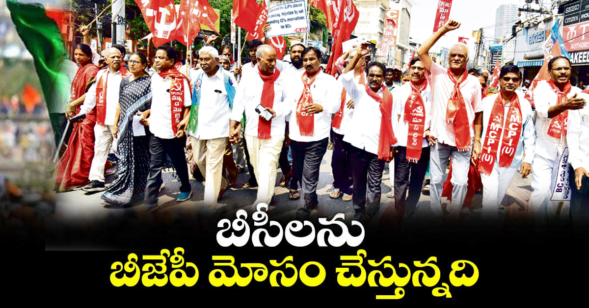”బీసీలకు 42 శాతం రిజర్వేషన్లపై బీజేపీ దొంగాట ఆడుతోంది. అసెంబ్లీలో రిజర్వేషన్ల బిల్లుకు ఆమోదం తెలిపి, కేంద్రంలో మోకాలడ్డుతోంది. దానికి గవర్నర్ వత్తాసు పలుకుతున్నారు. ఇది కచ్చితంగా అప్రజాస్వామిక చర్య. ఇలాంటి ద్వంద్వ ప్రమాణాల్ని సహించేది లేదు. కచ్చితంగా బీజేపీని గిరిగీసి,బరిలో నిలబెడతాం. ప్రజలకు ఆ పార్టీ చేస్తున్న వంచన రాజకీయాల్ని వివరిస్తాం” అని కమ్యూనిస్టు పార్టీలతో పాటు తెలంగాణ జనసమితి, అరుణోదయ, ప్రజాసంఘాల నేతలు స్పష్టం చేశారు. బీసీలకు 42 శాతం రిజర్వేషన్లు ఇవ్వాలని డిమాండ్ చేస్తూ వామపక్ష పార్టీలు ఇచ్చిన పిలుపులో భాగంగా శనివారం హైదరాబాద్లోని నారాయణగూడ చౌరస్తా నుంచి ఆబిడ్స్ వరకు నిరసన ప్రదర్శన నిర్వహించారు. సుల్తాన్బజార్, కోఠి, కింగ్కోఠి మీదుగా భారీ ర్యాలీ కొనసాగింది.