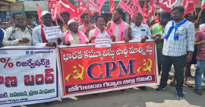 తెలంగాణ రాష్ట్రంలోని బీసీలు వేసిన ఓట్లతో గద్దెనెక్కిన ఎనిమిది మంది ఎంపీలు, ఎమ్మెల్యేలు, ముగ్గురు ఎమ్మెల్సీలు కేంద్ర ప్రభుత్వం పై ఒత్తిడి తెచ్చి రాజ్యాంగ సవరణ ద్వారా బీసీ రిజర్వేషన్లకు చట్టబద్ధత కల్పించే విధంగా ఒత్తిడి తీసుకురావాలని డిమాండ్ చేశారు.బీసీ రిజర్వేషన్ లపై నేడు తలపెట్టిన బంద్ పూర్తిగా బిజెపి కపట వైఖరికి, ధమన నీతికి, ద్వంద విధానాలకు వ్యతిరేకంగానే అనే విషయాన్ని తెలంగాణ సమాజం గుర్తించుకోవాలని అన్నారు. కాబట్టి తక్షణమే బీజేపీ రాజ్యాంగ సవరణ చేసి, 9వ షెడ్యూల్ లో చేర్చాలని, 42% నికి చట్ట బద్దత కల్పించాలని డిమాండ్ చేశారు. ఈ కార్యక్రమంలో సిపిఎం జిల్లా కమిటీ సభ్యులు ఉప్పేర్ నరసింహ, కార్మికులు రంగన్న, వీరేష్,బాబాన్న, గజేంద్ర, నరసింహ, భాస్కర్, రామకృష్ణ, తదితరులు పాల్గొన్నారు.