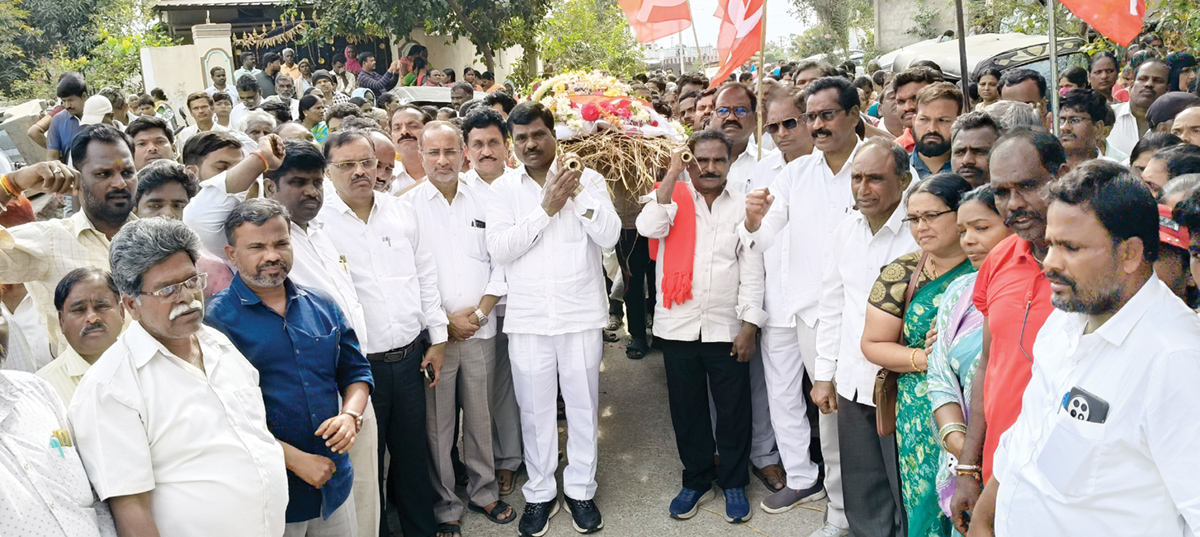 ఈ సందర్భంగా జాన్వెస్లీ మాట్లాడుతూ.. బ్రహ్మయ్య భవన నిర్మాణ కార్మికుడిగా పార్టీకి పరిచయమై అంచెలంచెలుగా ఎదిగారని తెలిపారు. పార్టీ యాచారం మండల కార్యదర్శిగా, సీఐటీయూ మండల కన్వీనర్గా పనిచేస్తూ కార్మికుల సమస్యలపై పోరాడారని చెప్పారు. అలాంటి నాయకుడి అకాల మరణం కార్మిక ఉద్యమానికి, పార్టీకి తీరని లోటని అన్నారు. ఆయన కుటుంబానికి పార్టీ ఎల్లవేళలా అండగా ఉంటుందని చెప్పారు. పార్టీలో, సీఐటీయూ ఉద్యమంలో కామ్రేడ్ బ్రహ్మయ్య అందించిన స్ఫూర్తిని ముందుకు తీసుకెళ్లాలని పిలుపునిచ్చారు. జాన్వెస్లీ, పార్టీ జిల్లా కార్యదర్శి పగడాల యాదయ్య తదితరులు బ్రహ్మయ్య పాడె మోశారు.