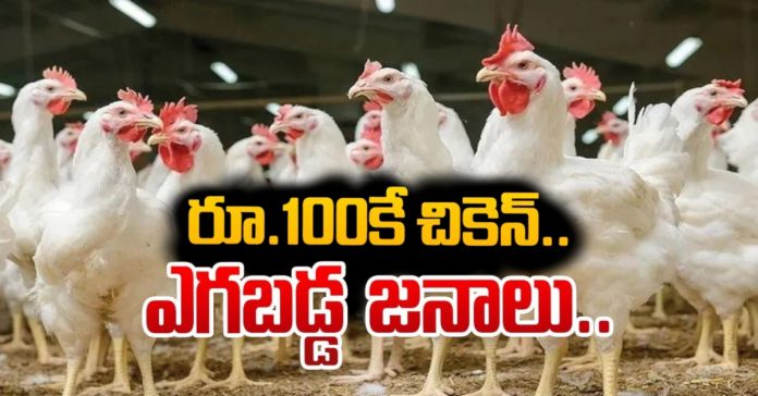 నవతెలంగాణ – హైదరాబాద్ : కర్నూలులో ఆదివారం వింత ఘటన చోటు చేసుకుంది. కోడుమూరులోని బళ్లారి రోడ్డులో ఇటీవల ఓ వ్యాపారి కొత్తగా చికెన్ వ్యాపారం ప్రారంభించాడు. మార్కెట్ రేటు కంటే తక్కువగా రూ.110కే కేజీ చికెన్ అమ్ముతున్నాడు. అది చూసిన మరో వ్యాపారి రూ.10 తగ్గించి రూ.100కే కేజీ చికెన్ అంటూ బోర్డు పెట్టాడు. దాంతో చుట్టుపక్కల గ్రామాల ప్రజలు సైతం కోడుమూరుకు వచ్చి చికెన్ కొనుగోలు చేశారు. కాగా, ప్రస్తుతం మార్కెట్లో కిలో చికెన్ రూ.200 పలుకుతుండగా.. స్కిన్ లెస్ రూ.230 వరకు ఉంది.