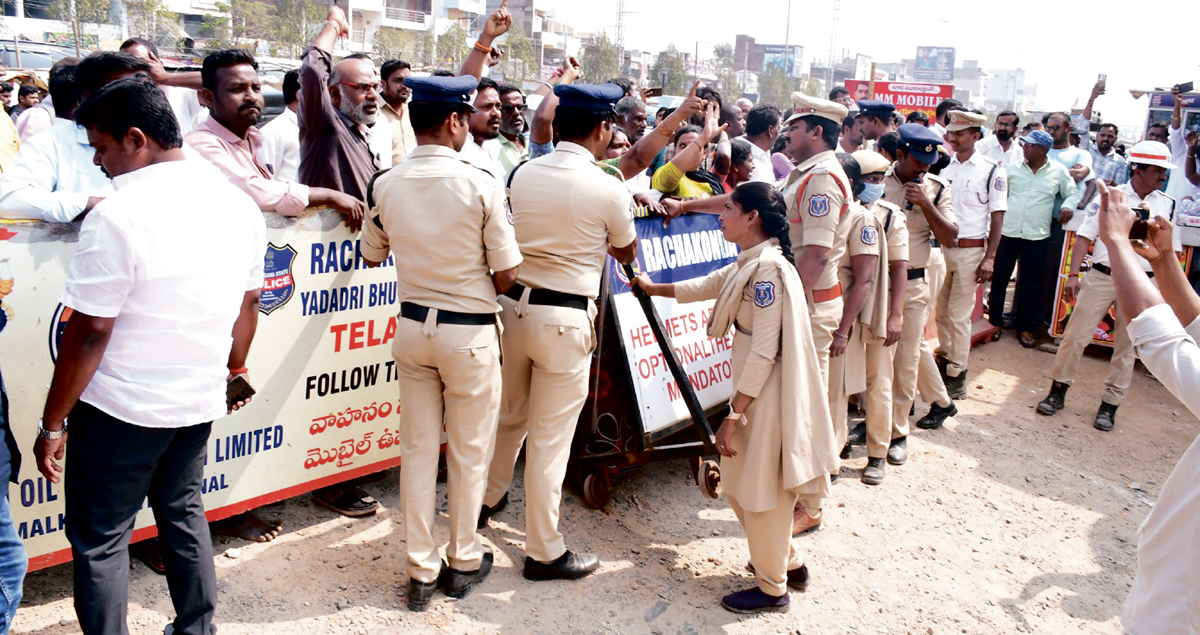 యాదాద్రిభువనగిరి జిల్లా చౌటుప్పల్ మున్సిపాలిటీలో చైర్మెన్,వైస్ చైర్మెన్ ఎన్నికల సందర్భంగా సోమవారం తీవ్ర ఉద్రిక్త పరిస్థితులు నెలకొన్నాయి. కౌన్సిలర్ల ప్రమాణస్వీకార కార్యక్రమానికి క్యాంపు నుంచి కాంగ్రెస్ పార్టీకి చెందిన కౌన్సిలర్లు బస్సులో బయలుదేరారు. ఈ క్రమంలో చైర్మెన్ పదవి తనకు దక్కదనే అసంతృప్తితో ఉన్న 13వ వార్డు కౌన్సిలర్ బత్తుల వాణి,ఆమె భర్త విప్లవ్ కుమార్ను స్థానిక ఎమ్మెల్యే కోమటిరెడ్డి రాజగోపాల్ రెడ్డి తన కారులో మున్సిపాలిటీ కార్యాలయానికి తీసుకు వస్తుండగా మున్సిపాలిటీ కేంద్రానికి రాగానే భారీకేడ్లను దాటే క్రమంలో వార్డు ప్రజలు,స్థానికులు ఎమ్మెల్యే కారును అడ్డుకున్నారు. ఆ సమయంలో కారు దిగిన బత్తుల వాణి పోలీసుల కండ్ల ముందే అక్కడి నుంచి పరార య్యారు. ఆమె మాత్రమే ప్రమాణస్వీకారం చేయ లేదు. ఎమ్మెల్యే ఇచ్చిన హామీ నిలబెట్టుకోలేదని ఆరో పిస్తూ ఆమె అనుచరులు మున్సిపాలిటీ కార్యాల యం ఎదుట నిరసనకు దిగారు. స్థానికుల కు కాకుండా స్థానికేతరులకు చైర్మెన్ పదవి కట్టబెడు తున్నారని ఆరోపిస్తూ ఫ్లకార్డులు ప్రదర్శించారు. ‘ఎమ్మెల్యే డౌన్ డౌన్’ అంటూ నినాదాలు చేశారు. పరిస్థితి ఉద్రిక్తంగా మారడంతో పోలీసులు భారీ బందోబస్తు ఏర్పాటు చేశారు. ఇదిలా ఉండగా మిగిలిన 12 మంది కౌన్సిలర్లు పోలీసుల భద్రత మధ్య చైర్మెన్,వైస్ చైర్మెన్లను ఏకగ్రీవంగా ఎన్నుకున్నారు.