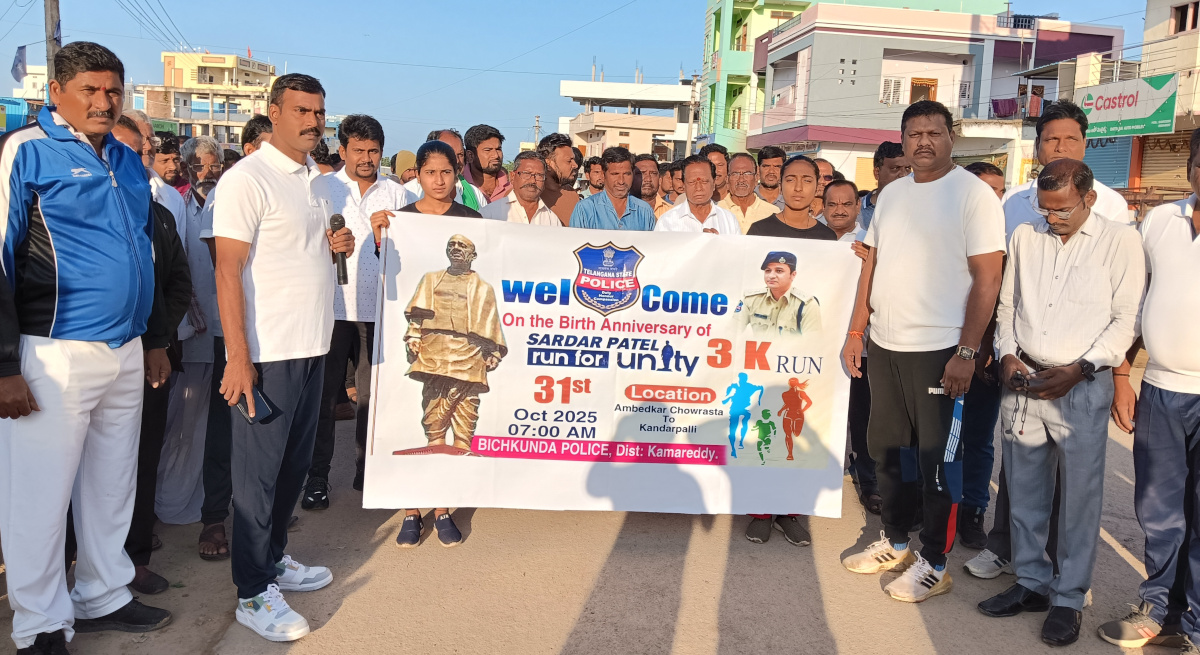 జాతీయ ఐక్యత దినోత్సవ సందర్భంగా ఐక్యత కోసం పరుగు కార్యక్రమాన్ని బిచ్కుంద పట్టణంలోని అంబేద్కర్ చౌరస్తా నుండి కందర్ పల్లి చౌరస్తా వరకు సీఐ రవికుమార్, ఎస్సై మోహన్ రెడ్డి ప్రారంభించారు. ఈ సందర్బంగా  సిఐ రవికుమార్ మాట్లాడుతూ.. భారతదేశ ప్రథమ హోంశాఖ మంత్రి సర్దార్ వల్లభాయ్ పటేల్ జయంతి సందర్భంగా జిల్లా ఎస్పీ ఆదేశాల మేరకు ఈ కార్యక్రమం నిర్వహించడం జరుగుతున్నదని తెలిపారు.  జాతీయ ఐక్యత దినోత్సవం ముఖ్య ఉద్దేశం భారతదేశపు పౌరులందరూ శాంతి ఐక్యత సోదర భావాన్ని కాపాడుటకు జాతీయ ఐక్యత దినోత్సవం నిర్వహించడం జరుగుతున్నదని ఈ కార్యక్రమం యొక్క ముఖ్య ప్రాముఖ్యతని వివరించారు. ఈ కార్యక్రమంలో గ్రామ పెద్దలు కొలవార్ కుమార్ సెట్, దర్పల్ గంగాధర్, గంగారం సార్, విజయభాస్కర్ రెడ్డి, అశోక్ పోలీస్ సిబ్బంది, విద్యార్థులు , యువకులు పాల్గొన్నారు.