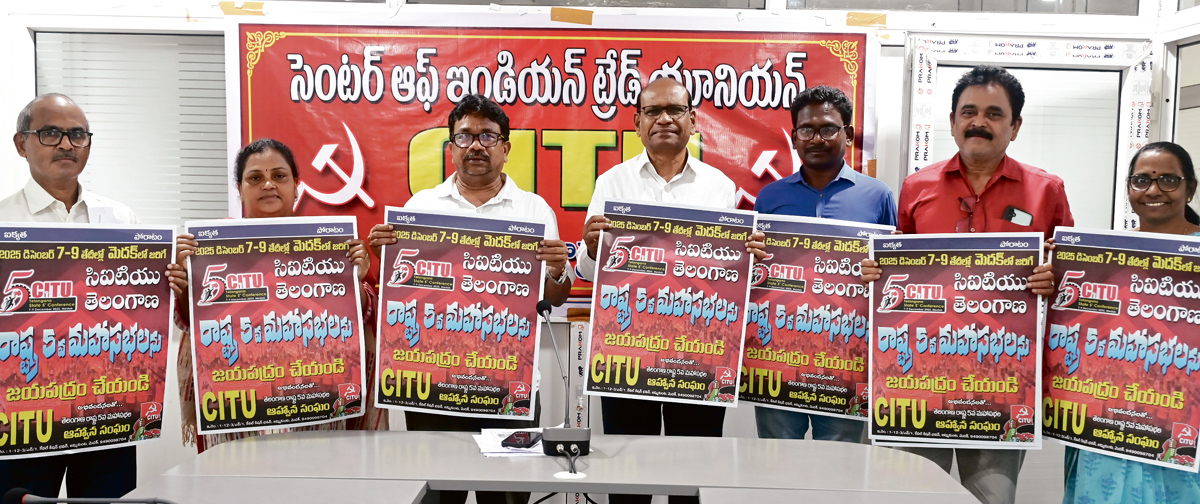 సీఐటీయూ రాష్ట్ర ఐదో మహాసభలు డిసెంబర్‌ 7,8,9 తేదీల్లో మెదక్‌ పట్టణంలో నిర్వహించబోతున్నామని ఆ యూనియన్‌ రాష్ట్ర అధ్యక్షులు చుక్కరాములు ప్రకటించారు. సోమవారం హైదరాబాద్‌లోని సీఐటీయూ రాష్ట్ర కార్యాలయంలో ఆ యూనియన్‌ రాష్ట్ర మహా సభల పోస్టర్‌ను ఆవిష్కరించారు. కార్యక్రమంలో ఆయనతో పాటు రాష్ట్ర ప్రధాన కార్యదర్శి పాలడుగు భాస్కర్‌, రాష్ట్ర ఉపాధ్యక్షులు ఎస్వీ. రమ, వీఎస్‌. రావు, రాష్ట్ర కార్యదర్శులు జె. వెంకటేష్‌, ఎం. పద్మశ్రీ పాల్గొన్నారు. ఈ సందర్భంగా రాములు మాట్లాడుతూ.. నూతన ఆర్ధిక విధానాలు, ప్రయివేటీకరణ, ప్రభుత్వరంగ సంస్థల పరిరక్షణ తదితర అంశాలపై సెమి నార్లు, సదస్సులు ఆహ్వాన సంఘం ఆధ్వర్యంలో నిర్వహిస్తున్నామని తెలి పారు. మహాసభల నిర్వహణకు ఆర్ధిక నిధుల సేకరణకు ఏర్పడిన టీమ్‌లు ముమ్మరంగా కృషి చేస్తున్నాయని కార్మికులు, ఉద్యోగులు, శ్రేయోభిలాషులు విరివి గా విరాళాలు ఇస్తున్నారని చెప్పారు. వ్యయ, ప్రయాసలతో కూడుకున్న మహా సభల నిర్వహణకు మేధావులు, ప్రజాతంత్రవాదులు, యావత్తు శ్రామికులు సహ కరించాలని విజ్ఞప్తి చేశారు. కేంద్రంలోని బీజేపీ ప్రభుత్వం రక్షణ రంగాన్ని పూర్తిగా ప్రయివేటీకరిస్తున్నదనీ, ఏడు కార్పొరేషన్లు ఏర్పాటు చేసిన తర్వాత బహుళజాతి గుత్త సంస్థలకు రక్షణ రంగాన్ని దారాధత్తం చేస్తున్నదని ఘాటుగా విమర్శించారు. మానిటైజేషన్‌ పైప్‌లైన్‌ పేరుతో ప్రభుత్వరంగ సంస్థల భూములను కారుచౌకగా కట్టబెట్టేందుకు రాష్ట్ర సర్కారు పూనుకుంటున్న తీరును ఎండగట్టారు. రైల్వే రంగాన్ని క్రమంగా ప్రయివేటీకరిస్తున్న తీరును వివరించారు. ప్రభుత్వ బ్యాంకులు, ఇన్సూరెన్స్‌ సంస్థల్లో మేనేజింగ్‌ డైరెక్టర్లు, ఎగ్జిక్యూటివ్‌ డైరెక్టర్లు, పుల్‌ టైమ్‌ డైరెక్టర్లను ప్రయివేటు వ్యక్తులతో నియమించుకోవడానికి కేంద్ర క్యాబినెట్‌ ఆమోదం తెలపడం దుర్మార్గమని విమర్శించారు. ఈ చర్యలు దేశ ఆర్ధిక సార్వభౌమత్వాన్ని దెబ్బతీస్తాయనీ, సామ్రాజ్యవాదులతో మిలాఖత్‌ కావడం దేశ ద్రోహమని అన్నారు. పాలడుగు భాస్కర్‌ మాట్లాడుతూ..30 రోజులుగా జరుగు తున్న గిరిజన ఆశ్రమ పాఠశాలల హాస్టల్‌ డైలీవేజ్‌ కార్మికుల సమ్మె డిమాండ్లను పరిష్కరించాలని రాష్ట్ర ప్రభుత్వాన్ని డిమాండ్‌ చేశారు. ప్రభుత్వ పాఠశాలల్లో పనిచేస్తున్న స్కావెంజర్లకు జీతాల పెంపు, జీవన ప్రమాణాలు, కార్మిక హక్కులు అమలు చేయాలని అన్నారు. షెడ్యూల్డ్‌ ఎంప్లారుమెంట్స్‌లోని కార్మికులకు కనీస వేతనాల పెంపుదలకు కనీస వేతన సలహా మండలి సిఫార్సులను రాష్ట్ర ప్రభుత్వం బేఖాతరు చేయడం అన్యాయమన్నారు. రాష్ట్ర ప్రభుత్వం తక్షణమే కార్మికుల సమస్యల పరిష్కారంపై దృష్టి సారించాలని డిమాండ్‌ చేశారు.