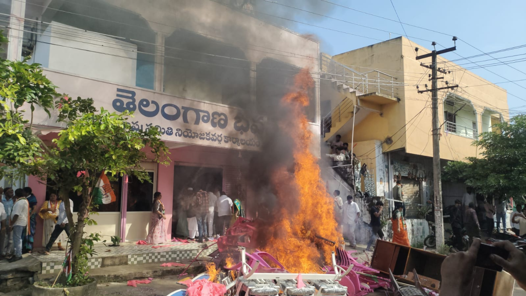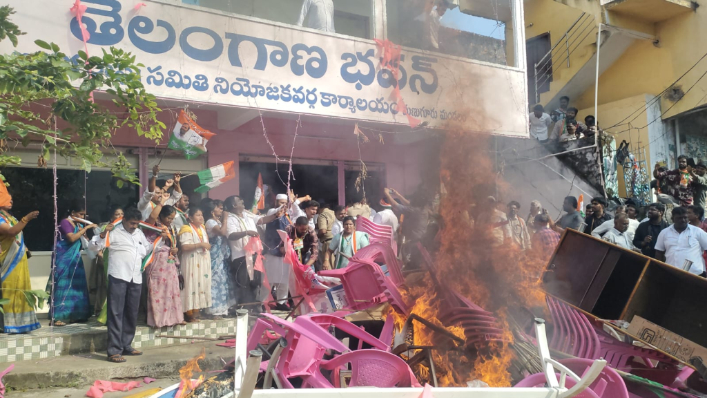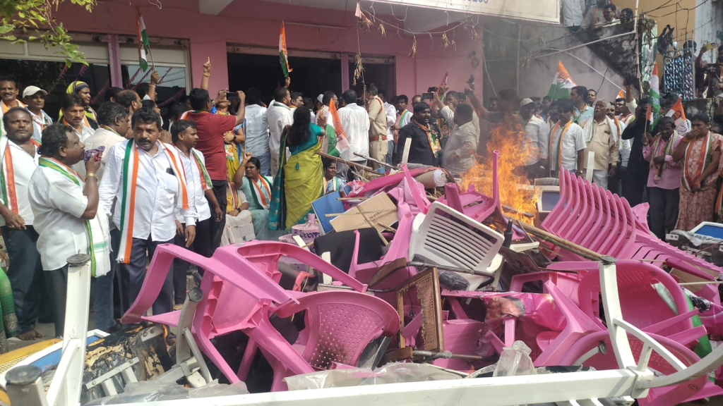 నవతెలంగాణ – హైదరాబాద్ : భద్రాద్రి కొత్తగూడెం జిల్లా మణుగూరులో హైటెన్షన్ వాతావరణం నెలకొంది. స్థానిక బీఆర్ఎస్ కార్యాలయంపై కాంగ్రెస్ కార్యకర్తలు దాడి చేసి ఆఫీసును ధ్వంసం చేశారు. బీఆర్ఎస్ ప్రభుత్వం అధికారంలో ఉన్న సమయంలో అప్పటి ఎమ్మెల్యే పోలీసు బందోబస్తుతో కాంగ్రెస్ పార్టీ కార్యాలయాన్ని ఆక్రమించి, గులాబీ రంగులు వేయించినట్లు కాంగ్రెస్ నాయకులు ఆరోపించారు. ఈ నేపథ్యంలో ఆదివారం ఉదయం కాంగ్రెస్ శ్రేణులు “మా కార్యాలయం మాకు కావాలి” అంటూ ఆందోళనకు దిగారు. ఆగ్రహంతో ఉన్న కాంగ్రెస్ కార్యకర్తలు బీఆర్ఎస్ ఆఫీస్లోని ఫర్నిచర్ వస్తువులను ధ్వంసం చేసి తగలబెట్టారు. కార్యాలయ ప్రాంగణంలో భారీగా పొగలు, మంటలు వ్యాపించాయి. ఆఫీస్పై కాంగ్రెస్ జెండా ఎగురవేశారు. దీంతో ఆ ప్రాంతంలో ఉద్రిక్తత వాతావరణం నెలకొంది. సమాచారం అందుకున్న పోలీసులు సంఘటనా స్థలానికి చేరుకుని పరిస్థితిని అదుపులోకి తీసుకొచ్చారు.