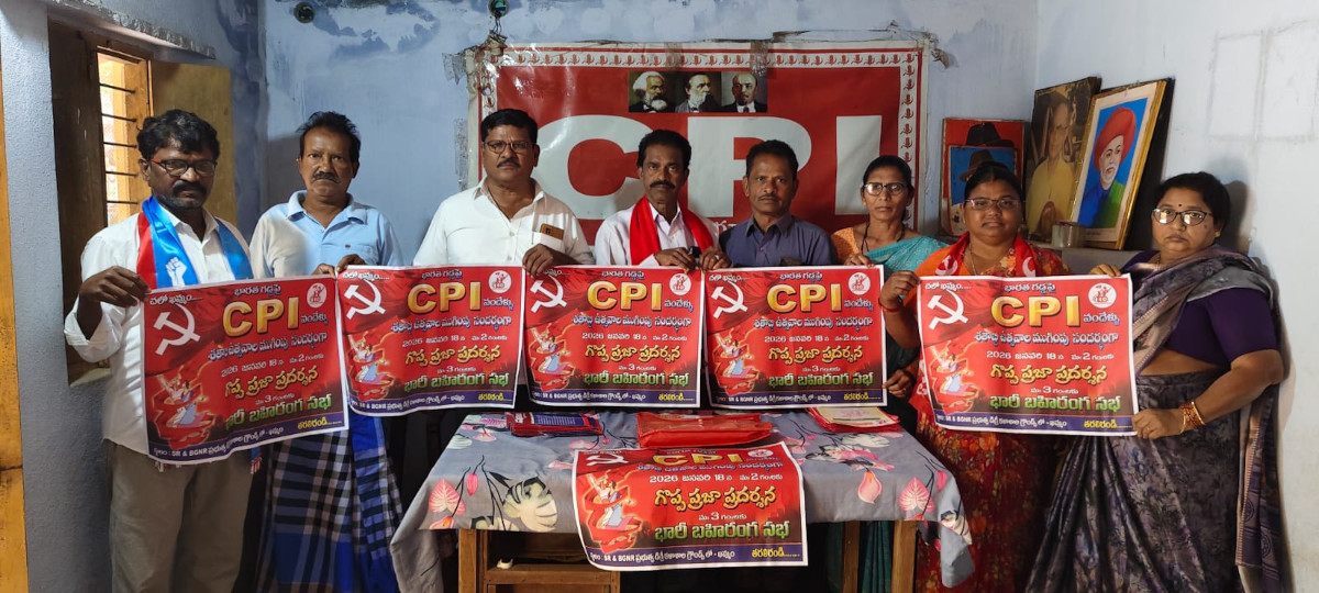 భారత కమ్యూనిస్టు పార్టీ 100 సంవత్సరాల అఖిలభారత స్థాయి ముగింపు ఉత్సవాలు జనవరి 18న 2026 ఖమ్మంలో లక్షలాదిమందితో సిపిఐ పార్టీ బహిరంగ సభ నిర్వహిస్తున్నట్లు సిపిఐ జిల్లా కార్యవర్గ సభ్యులు బంటు వెంకటేశ్వర్లు తెలిపారు. మంగళవారం స్థానిక ఆ పార్టీ కార్యాలయంలో బహిరంగసభ పోస్టర్ ను ఆవిష్కరించారు. ఈ సందర్భంగా ఆయన మాట్లాడుతూ.. ఈ బహిరంగ సభకు 40 ప్రపంచ దేశాలు ప్రతినిధులు హాజరవుతున్నారని వారన్నారు. భారీ ప్రదర్శన బహిరంగ సభ వేలాది మందితో జన సేవాదళ్ కవాతులు ప్రదర్శనలు జరుగుతాయన్నారు. యూపీఏ వన్ ప్రభుత్వంలో చరిత్రత్నిక సమాచార హక్కు చట్టం ఉపాధి హామీ పథకం అటవీ హక్కుల చట్టం తీసుకురావడానికి సిపిఐ కృషి చేసిందన్నారు. అటవీ హక్కుల చట్టం ద్వారా దేశంలో గిరిజన బలహీన వర్గాలకు చెందిన 50 లక్షల పైగా కుటుంబాలు కోటి ఎకరాలు భూమిపై హక్కు పొందెందుకు సిపిఐ పార్టీ ఎంతగానో పోరాడిందన్నారు.