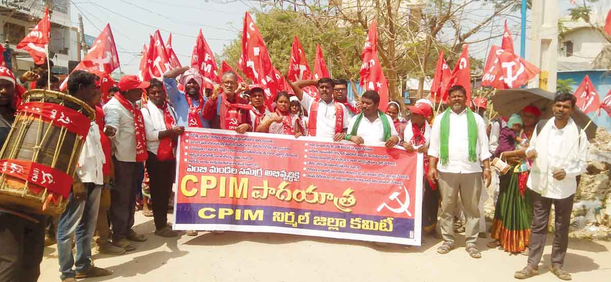 నిర్మల్ జిల్లా పెంబి మండల సమగ్ర అభివృద్ధి కోసం శనివారం సీపీఐ(ఎం) ఆధ్వర్యంలో పాదయాత్ర ప్రారంభమైంది. సీపీఐ(ఎం) రాష్ట్ర కార్యదర్శివర్గ సభ్యులు బండారు రవికుమార్ రాష్ట్ర కమిటీ సభ్యులు ఉడత రవీందర్, పూసం సచిన్తో కలిసి యాపల్గూడ గ్రామంలో పాదయాత్రను ప్రారంభించారు. ఈ సందర్భంగా బండారు రవికుమార్ మాట్లాడుతూ.. మారుమూల మండలమైన పెంబి సమస్యలను ప్రభుత్వం, అధికార యంత్రాంగం దృష్టికి తీసుకు వచ్చేందుకు తమ పార్టీ ఆధ్వర్యంలో పాదయాత్ర చేపట్టినట్టు తెలిపారు. దోత్తి, కడెం వాగులపై తక్షణమే వంతెనలు నిర్మించాలని, పులగంపండ్రి నుంచి సిరిచల్మా వరకు లింకు రహదారి నిర్మించాలని, పసుపుల-మందపెల్లి-రాజురా వంతెనల నిర్మాణాన్ని త్వరగా పూర్తి చేయాలని డిమాండ్ చేశారు.
