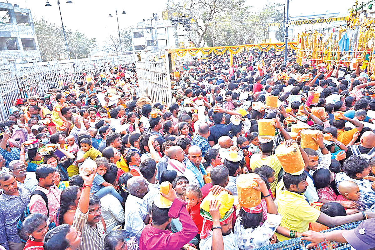 మేడారం సమ్మక్క-సారలమ్మ జాతర మూడో రోజైన శుక్రవారం భక్తులు పోటెత్తారు. సమ్మక్క, సారలమ్మ, పగిడిగిద్దరాజు, గోవిందరాజులు గద్దెల వద్దకు చేరుకోవడంతో మేడారం జనసంద్రంగా మారింది. ప్రముఖులు సైతం సందర్శనకు రావడంతో రహదారులన్నీ రద్దీగా మారాయి. శుక్రవారం ఉదయం హెలికాప్టర్లో మేడారం చేరుకున్న రాష్ట్ర గవర్నర్ జిష్ణుదేవ్ వర్మ, మాజీ గవర్నర్ బండారు దత్తాత్రేయకు మంత్రి సీతక్క స్వాగతం పలికారు. వారు వనదేవతలను దర్శించుకుని నిలువెత్తు బంగారం(బెల్లం) సమర్పించి మొక్కులు చెల్లించుకున్నారు. మంత్రి దనసరి అనసూయ కుటుంబ సమేతంగా సమ్మక్క సారలమ్మల దర్శనం చేసుకున్నారు.