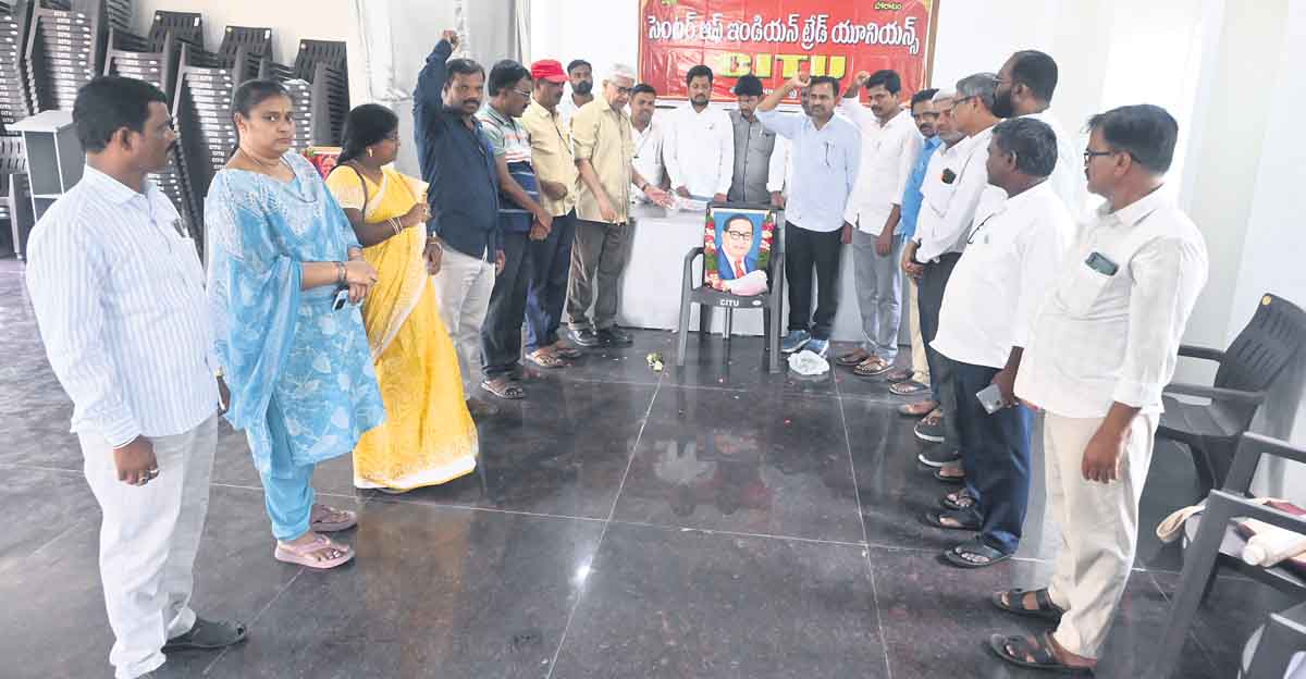 ఆర్థిక, సామాజిక, మహిళా సమానత్వమే అంబేద్కర్ జీవితాశయం అని సీఐటీయూ రాష్ట్ర ఉపాధ్యక్షులు ఆర్ సుధాభాస్కర్ అన్నారు. మంగళవారం హైదరాబాద్లోని సీఐటీయూ రాష్ట్ర కార్యాలయంలో ఆ సంఘం రాష్ట్ర కోశాధికారి వంగూరు రాములు అధ్యక్షతన డాక్టర్ బీఆర్ అంబేద్కర్ 135వ జయంతిని నిర్వహించారు. ఈ సందర్భంగా అంబేద్కర్ చిత్రపటానికి సుధాభాస్కర్ పూలమాలేసి నివాళులర్పించారు. అనంతరం ఆయన మాట్లాడుతూ కేంద్రంలో అధికారంలో ఉన్న బీజేపీ సర్కారు అంబేద్కర్ ఆశయాలకు తూట్లు పొడుస్తున్నదని విమర్శించారు. దేశంలోని ప్రభుత్వ ఆస్తులను, సహజ వనరులను కార్పొరేట్లకు అప్పనంగా కట్టబెడుతున్నదని ఆందోళన వ్యక్తం చేశారు. కార్మిక-కర్షక, ప్రజా వ్యతిరేక విధానాలతో దేశంలో పేదల సంఖ్య 90 శాతానికి పెరిగిందని ఆవేదన వ్యక్తం చేశారు. దేశ సంపద మాత్రం కొందరి చేతుల్లో పోగుపడుతున్న తీరును వివరించారు. కార్యక్రమంలో కేవీపీఎస్ రాష్ట్ర ప్రధాన కార్యదర్శి టి స్కైలాబ్బాబు, డీవైఎఫ్ఐ రాష్ట్ర అధ్యక్షులు కోట రమేష్, సీఐటీయూ రాష్ట్ర కార్యదర్శి కూరపాటి రమేష్, రాష్ట్ర కమిటీ సభ్యులు వై. సోమన్న, ఎ. సునీత తదితరులు పాల్గొన్నారు.