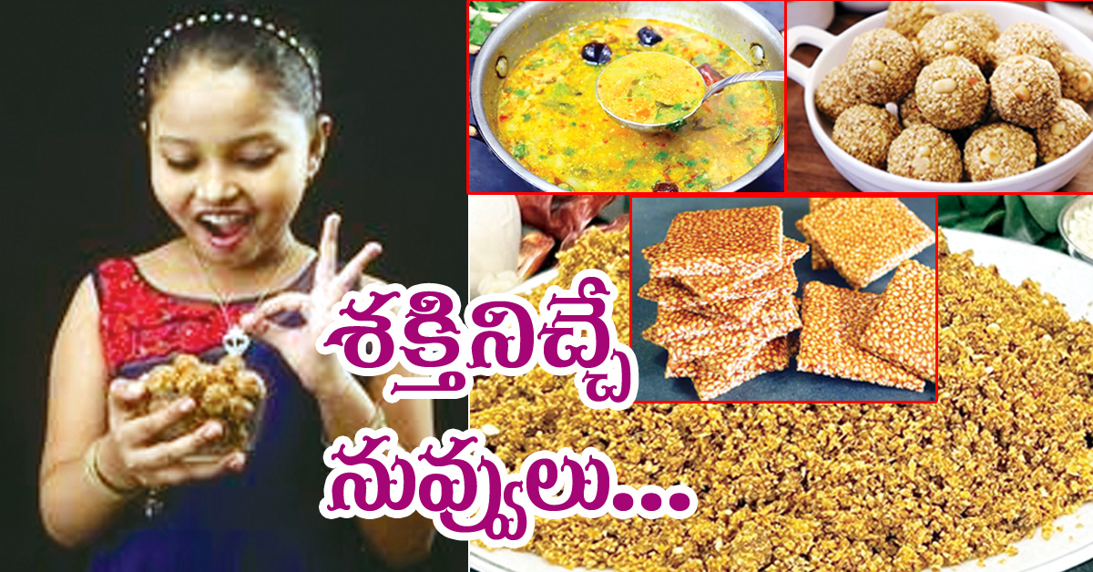 కాల్షియం, ఐరన్, మెగ్నీషియం, ఫాస్పరస్ వంటి ముఖ్యమైన మూలకాలు పుష్కలంగా ఉన్న నువ్వులు చలికాలంలో తినడం వల్ల ఎన్నో ప్రయోజనాలు ఉన్నాయి. ఇక ఇవి ఎదుగుతున్న పిల్లలలో బలమైన ఎముకల అభివృద్ధికి తోడ్పడతాయి. అంతేకాదు.. వీటిలో ఉండే మోనో అసంతృప్త కొవ్వులు వారి మెదడు అభివృద్ధికి, గుండె ఆరోగ్యానికి ఎంతో మేలు చేస్తాయి. నువ్వులలో ప్రొటీన్లు కూడా పుష్కలంగా ఉంటాయి. అలాగే యాంటీ ఆక్సిడెంట్లు సమృద్ధిగా ఉండి పిల్లల్లో ఆక్సీకరణ ఒత్తిడిని తగ్గించి బలమైన రోగనిరోధక శక్తిని ప్రోత్సహిస్తాయి. అదేవిధంగా నువ్వులలోని పోషకాలు వారికి సహజమైన శక్తిని అందిస్తూ రోజంతా యాక్టివ్గా ఉండడానికి సహాయపడతాయి. అలాగే చిన్నారుల్లో జీర్ణవ్యవస్థను మెరుగుపరచడంలో నువ్వులు చాలా బాగా ఉపయోగపడతాయి. ఇన్ని ఆరోగ్య ప్రయోజనాలున్న నువ్వులతో రకరకాల వంటలు చేసుకోవచ్చు. అవేంటో తెలుసుకుందాం…