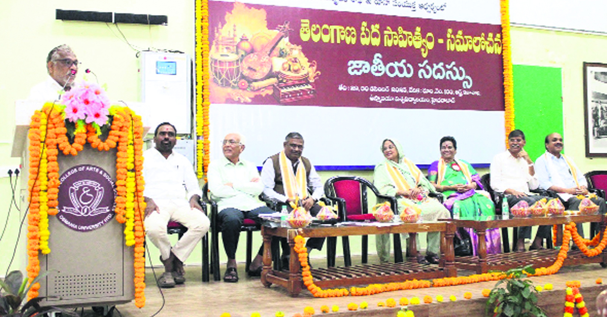 తెలంగాణలోని ప్రతిపల్లె పద సాహిత్యాలతో, భజన కీర్తనలతో విరాజిల్లుతోందని ఎమ్మెల్సీ, ప్రముఖ వాగ్గేయకారులు గోరటి వెంకన్న అన్నారు. సోమవారం ఓయూ ఆర్ట్స్ కళాశాల వేదికగా, తెలుగు శాఖ నిర్వహించిన ”తెలంగాణ పద సాహిత్యం – సమాలోచన” అనే జాతీయ సదస్సుకు ఆయన ముఖ్య అతిథిగా హాజరయ్యారు. కీలక ఉపన్యాసం చేసిన ప్రముఖ పరిశోధకులు పి భాస్కర యోగి మాట్లాడుతూ సాహిత్య చరిత్రలో విస్మరణకు గురైన ఎందరో పద కవులపై విస్తృతమైన పరిశోధనలు జరగడం అభినందించదగిన విషయమని అన్నారు. ఆ దిశలో తెలుగు శాఖ ఉస్మానియా విశ్వవిద్యాలయం ఆర్ట్స్ కాలేజీలో తెలంగాణ పద సాహిత్యంపై జాతీయ సదస్సు నిర్వహించడం గర్వించదగ్గ విషయమని చెప్పారు. తెలుగుశాఖ అధ్యక్షులు ఆచార్య సాగి కమలాకర శర్మ అధ్యక్షత జరిగిన ఈ కార్యక్రమంలో సురవరం ప్రతాపరెడ్డి తెలుగు విశ్వవిద్యాలయం ఉపాధ్యక్షులు ఆచార్య వెలుదండ నిత్యానందరావు, తెలంగాణ సాహిత్య అకాడమీ మాజీ అధ్యక్షులు నందిని సిధారెడ్డి, ఆర్ట్స్ కళాశాల ప్రిన్సిపల్ సి కాశీం, డీన్ ఫ్యాకల్టీ ఆఫ్ ఆర్ట్స్ ఆచార్య సైద తలత్ సుల్తానాలు ప్రసంగించారు. ఈ సదస్సులో తెలంగాణ పద సాహిత్యంపై ప్రామాణికమైన పరిశోధన పత్రాలను సమర్పించారు. రాష్ట్రంలోని సబ్బండ వర్గాల వారి సాంస్కృతిక విశేషాలను, తాత్విక విషయాలపై పద కవుల సాహిత్యంపై లోతైన విశ్లేషణలు అవసరమని పలువురు వక్తలు అభిప్రాయపడ్డారు. ఈ సదస్సు స్ఫూర్తితో పలువురు పద కర్తలపై విస్తృతమైన పరిశోధనలు సమగ్రంగా జరగడానికి దారులు ఏర్పడ్డాయని అభిప్రాయపడ్డారు. ఈ సదస్సులో తెలుగు పాఠ్యప్రణాళికా సంఘం అధ్యక్షులు ఏలే విజయలక్ష్మి, తెలుగుశాఖ అసోసియేట్ ప్రొఫెసర్ ఎస్ రఘు, విస్తాలి శంకర్రావు, పిసి వెంకటేశ్వర్లు, బాణాల భుజంగరెడ్డి, ఇమ్మిడి మహేందర్, అవుసుల భాను ప్రకాష్ తదితరులు ప్రసంగించారు.