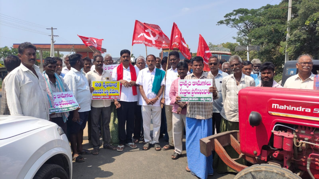 : వైరా మార్కెట్‌లో గత 15 రోజులుగా వరి ధాన్యాన్ని తీసుకువచ్చిన రైతులు కొనుగోలు లేకపోవడంతో తీవ్ర ఇబ్బందులు ఎదుర్కొంటున్నారు. ప్రభుత్వం నిర్లక్ష్యంగా వ్యవహరిస్తోందని ఆగ్రహించిన రైతులు రైతు సంఘం ఆధ్వర్యంలో వందలాదిగా వైరా మార్కెట్ ముందు రోడ్డుపై బైఠాయించి ఆందోళన చేపట్టారు. ఈ ఆందోళనకు సీపీఐ(ఎం), బీఆర్ఎస్ పార్టీ నాయకులు మద్దతు తెలిపారు. వెంటనే వైరా మార్కెట్‌లో వరి ధాన్యం కొనుగోలు కేంద్రాన్ని ప్రారంభించి రైతుల ధాన్యాన్ని కొనుగోలు చేయాలని సీపీఐ(ఎం) వైరా డివిజన్ కార్యదర్శి భూక్యా వీరభద్రం, రైతు సంఘం జిల్లా కార్యదర్శి బొంతు రాంబాబు, పట్టణ కార్యదర్శి కొంగర సుధాకర్ డిమాండ్ చేశారు.