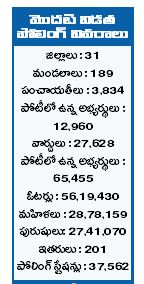 ఇందులో 27,41,070 మంది పురుష ఓటర్లు, 28,78,159 మంది మహిళా ఓటర్లు, 201 మంది ఇతరులు ఉన్నారని వివరించారు. 31 జిల్లాల్లో 37,562 పోలింగ్ స్టేషన్లు ఏర్పాటు చేసినట్టు తెలిపారు. ప్రతీ పోలింగ్ స్టేషన్ వద్ద సీసీ కెమెరాలను ఏర్పాటు చేశామని పేర్కొన్నారు. ఎన్నికల నిర్వహణకు 3,591 మంది రిటర్నింగ్ అధికారులను, 93,905 మంది ఇతర సిబ్బందిని నియమించినట్టు వివరించారు. ఓటు వేసే వారు తమ ఓటర్ కార్డు, ఆధార్ కార్డు, రేషన్ కార్డు, డ్రైవింగ్ లైసెన్స్ తదితర 18 రకాల ఐడీ కార్డులలో ఏదైనా కేంద్రానికి తీసుకొచ్చేందుకు అనుమతించినట్టు తెలిపారు. ఎన్నికలు జరుగుతున్న జిల్లాల్లో కలెక్టర్లకు మెజిస్ట్రీయల్ అధికారాలలిస్తూ ఆదేశాలు జారీ చేసినట్టు కమిషనర్ రాణి కుముదిని తెలిపారు. పోలింగ్లో స్వచ్ఛందంగా పాల్గొనాలని ఆమె ఓటర్లకు పిలుపునిచ్చారు.